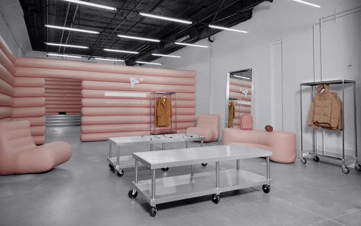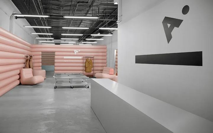 该空间基于现有的店面,里面有砖墙和混凝土地板,墙壁用白色墙壁,黑色天花板和36盏微荧光灯管进行了大修,为里面的玫瑰色安装提供了工业基础。粉红色的空气填充墙是由超长的管子相互堆叠而成,并通过锚点连接到现有的砖墙上。与概念店的临时设计保持一致。共有79根直径为12英寸的可充气管,它们通过一个自动阀单独充气,并在5个月的pop-up期间保持气密性。