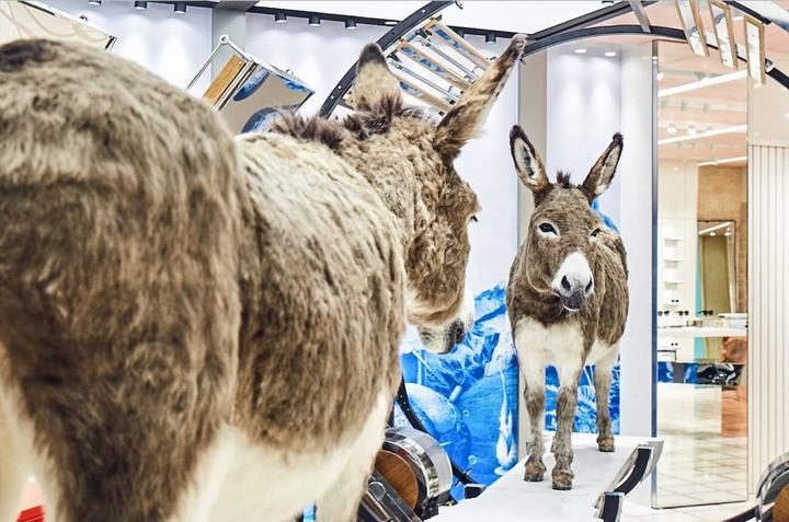 这里的主题是“记忆”,这是一个高度兼收并蓄的装置作品,画面上是一位栩栩如生的老妇人,她坐在那里,神情沉思,背景是两头驴子。这些动物分别站在一个基座上,彼此相对,象征着这位女性的记忆。