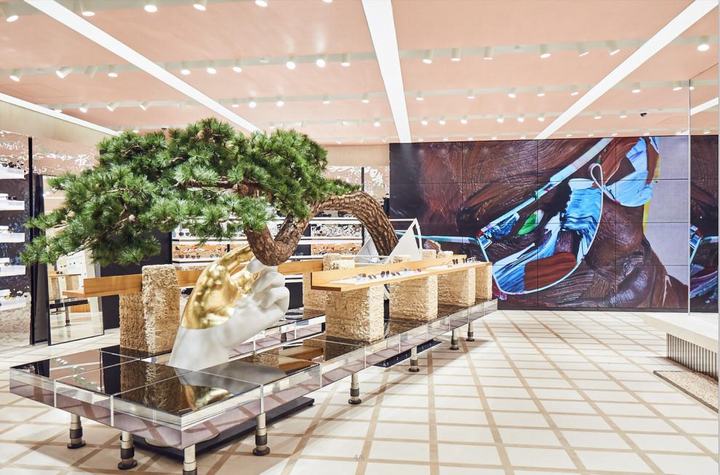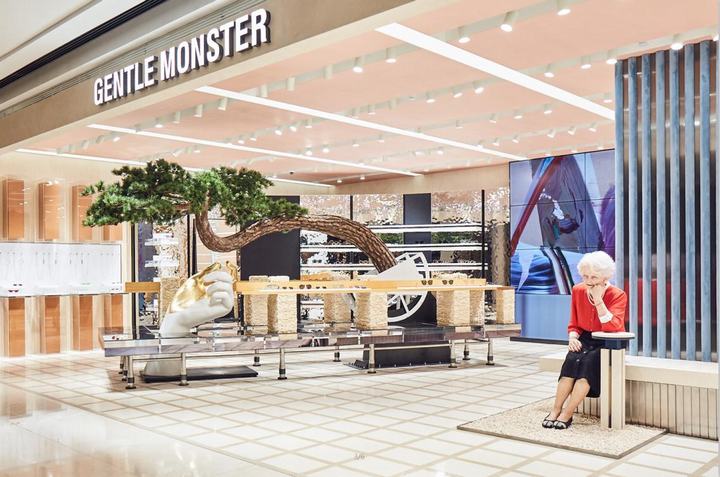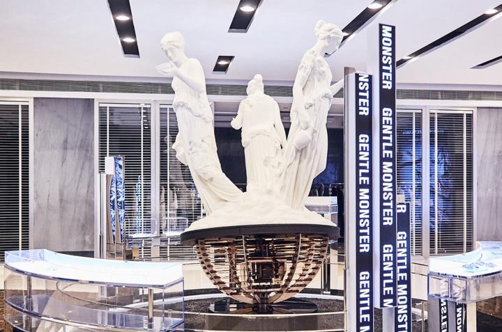 基座中间是一架似乎在移动的飞船部件,部件后面是一幅精美的壁画。在这里的其他地方,还可以找到另外两个同样具有艺术气息的装置。一幅是一根巨大的松树树枝,看起来像盆栽盆景,放在一个高架的有机玻璃平台上;另一幅是三个罗马雕像,放在一个旋转的金属基座上。两者都作为一个展示,因为他们混合和匹配的Gentle Monster的令人垂涎的眼镜,要么展示在他们或旁边。
