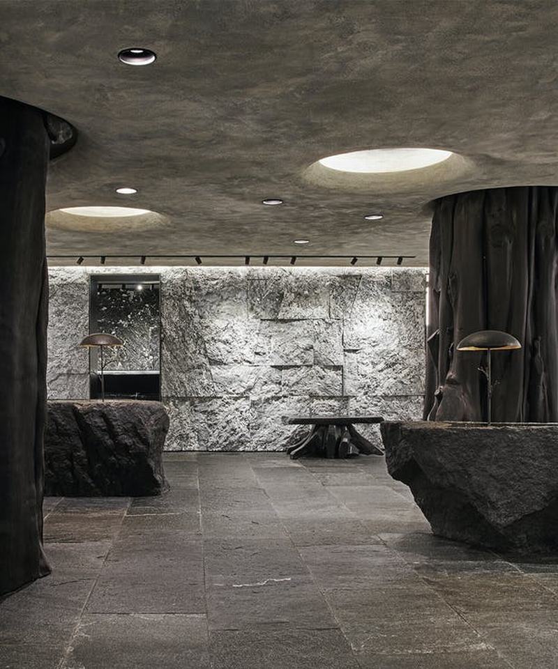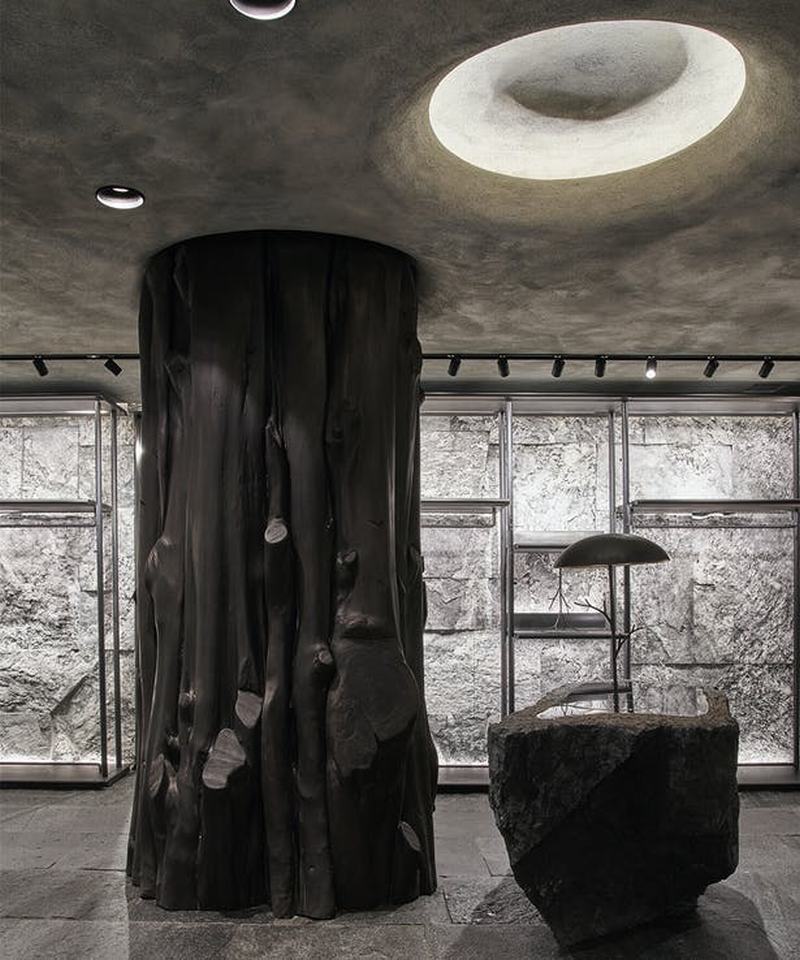 来自提契诺州的粗糙花岗岩石板看起来像岩石的表面,被选择了主要的白色和强烈的灰色纹理,以保持一种舒适但不太黑暗的氛围。两棵由烧焦的雪松做成的树干,Cedrus Libani和Cupressus Macrocarpa平衡了花岗岩墙壁和地板,成为了商店里的艺术品。
