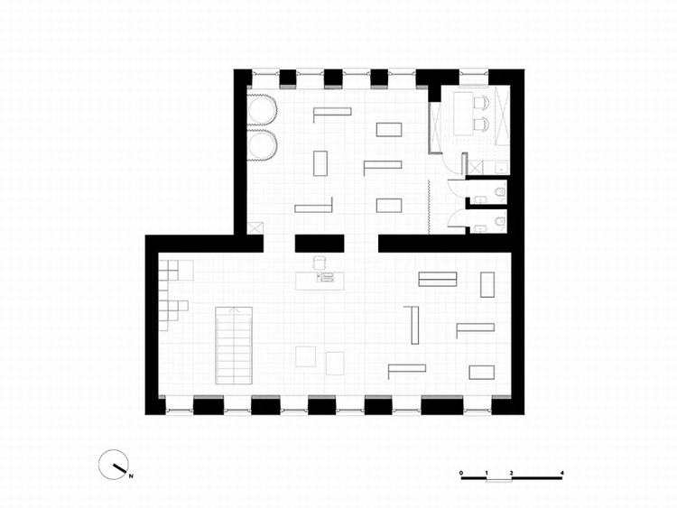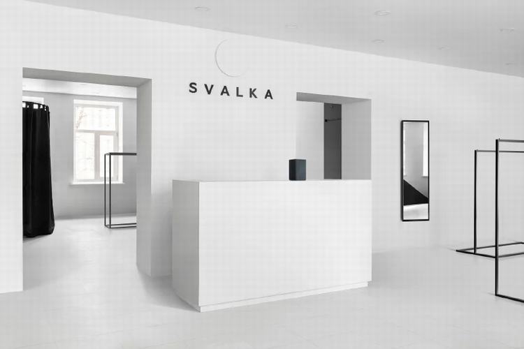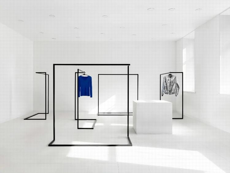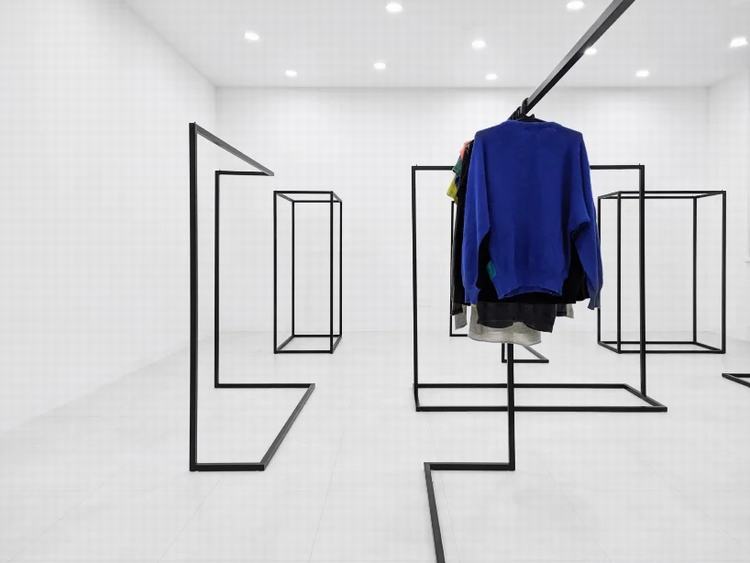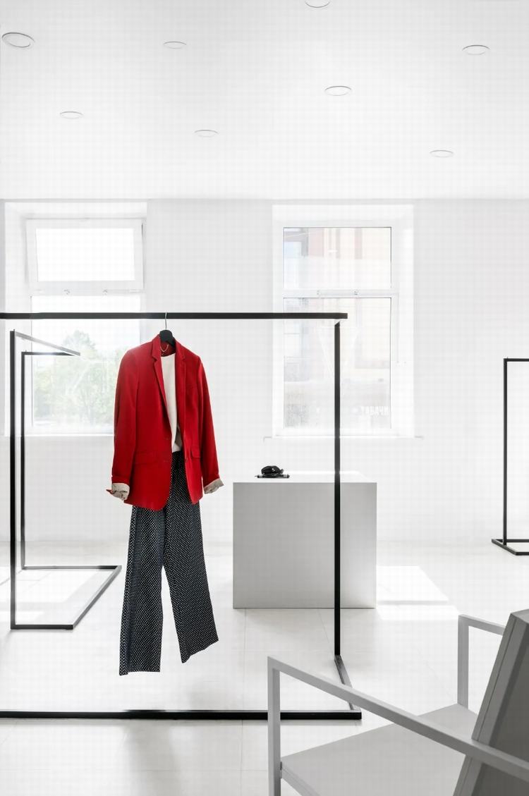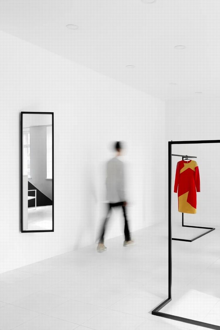 通过楼梯时,游客会遇到一个简洁的意识空间。环境的简单性为室内的所有物体赋予了新的含义-现在看起来像艺术品。商店分为两个大厅,第一个大厅包含一个书架,一个简约的接待台,在前面有大型展示柜和合作产品,主要区域有吊轨。在第二个大厅中,有衣服和两个更衣室。