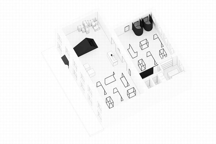 由mptns设计的室内装饰的独特之处在于商店的入口,该入口将访客从街道直接引向二楼。楼梯几乎出现在大厅中间,由倾斜的立方体覆盖,强调了布局的独特性。这种设计是从混乱过渡到有序的象征。