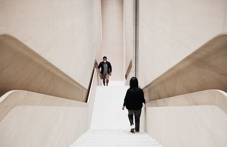 苹果三里屯利用该地区的活力,有一个多孔的建筑围护结构,向四面开放,并连接到多层次的流通网络。面对中心广场的主玻璃立面使内部的展示区域充满了自然光线。两个巨大的石头楼梯在商店的两侧,通向上层的Genius Grove。后面的玻璃立面使光线进入空间,并消除了室内外的边界。论坛位于大上层,形成了一个生动的背景空间,与综合软垫皮革座椅,形成了一个室外热闹的广场的观景廊。
