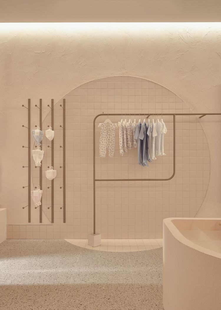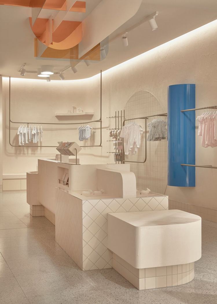 Doherty Design Studio与Marquise的品牌代理Ortolan合作,希望打造一个有趣而精致的店铺。贯穿整个设计作品的曲线规划,在视觉上扩大了狭小空间的同时,展示了迷你婴儿服装的乐趣。