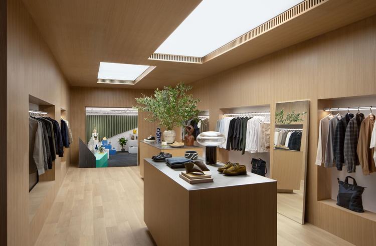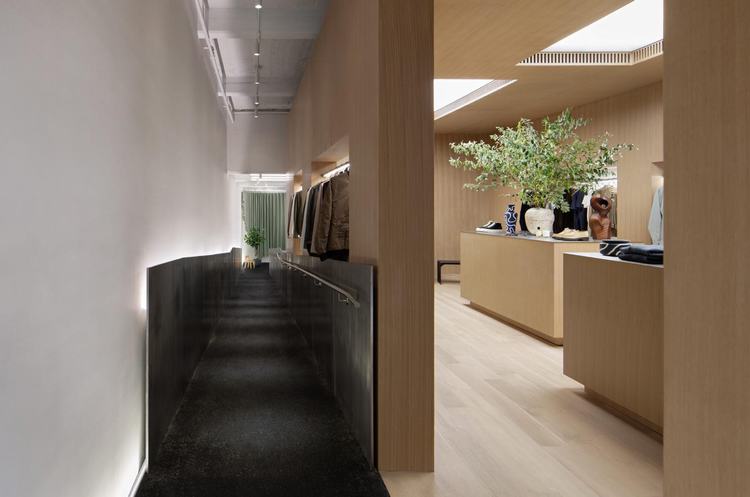 在O.N.S商店实际入口的旁边,有一条狭窄的走廊,上面满是定制的65英尺(约20 m)不锈钢坡道,直接通向较低层。在木结构内部,展现了干净低调的环境,墙壁,地板和轻木天花板都配有轻巧的木质,配以相匹配的大型展示架和哑光金属顶板。