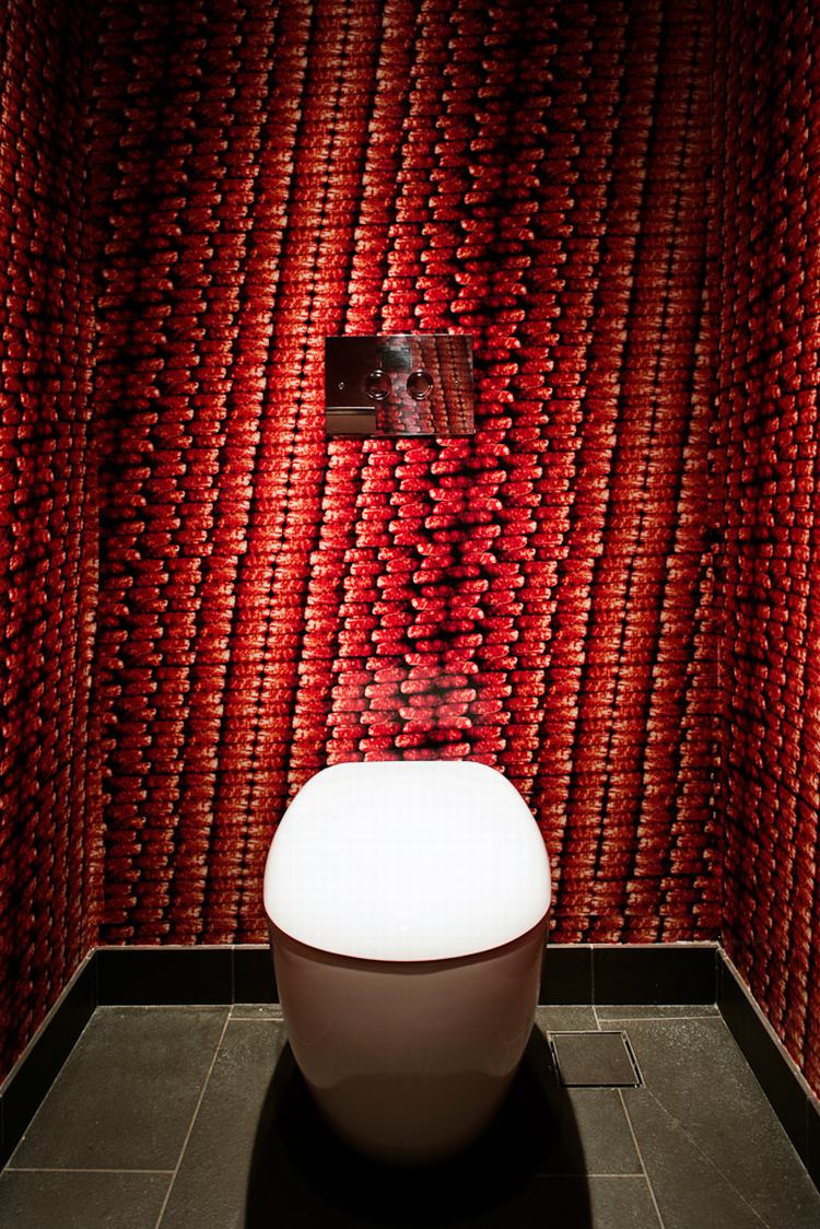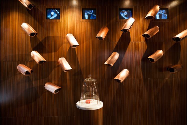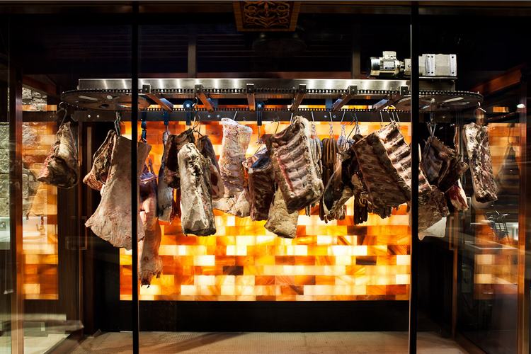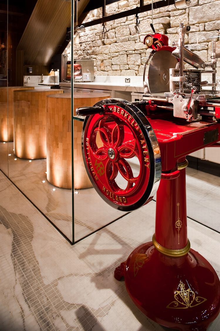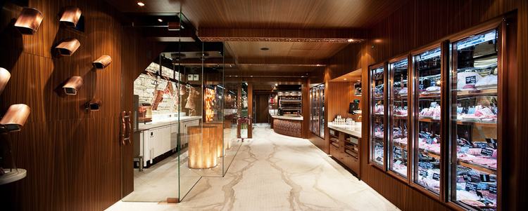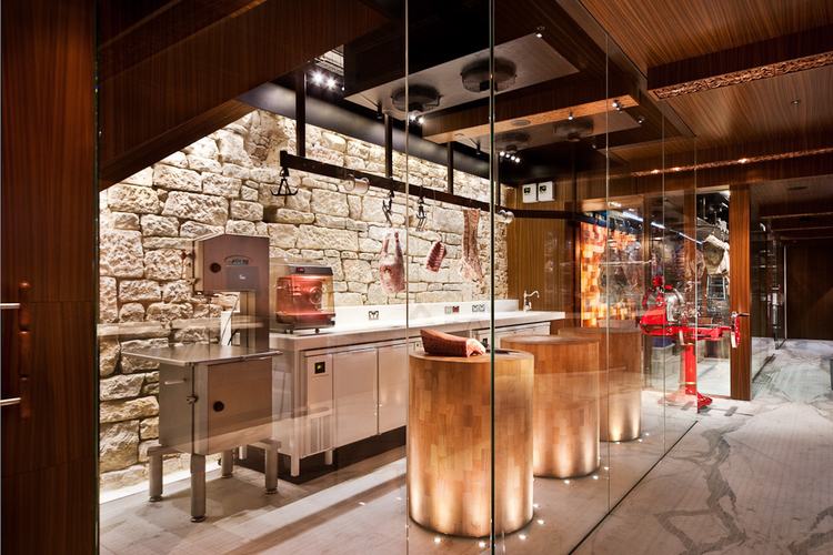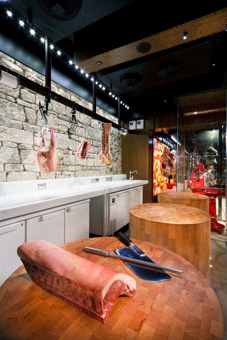 屠夫在一个冷藏空间中,在三个橡木圆台加工肉制品,就和寿司厨师一样,整个加工过程清晰可见。背面砂岩“鹅卵石”墙作为背景,充满了历史感。