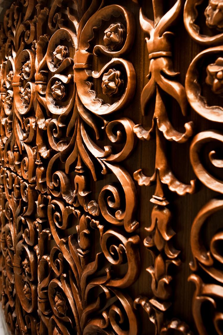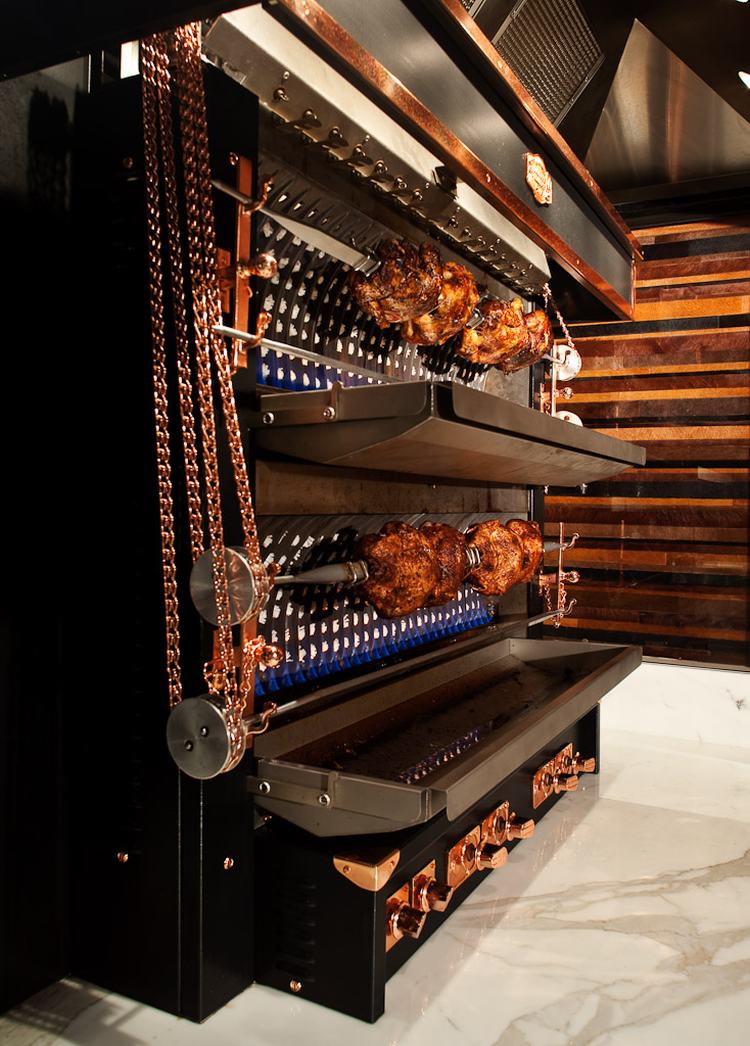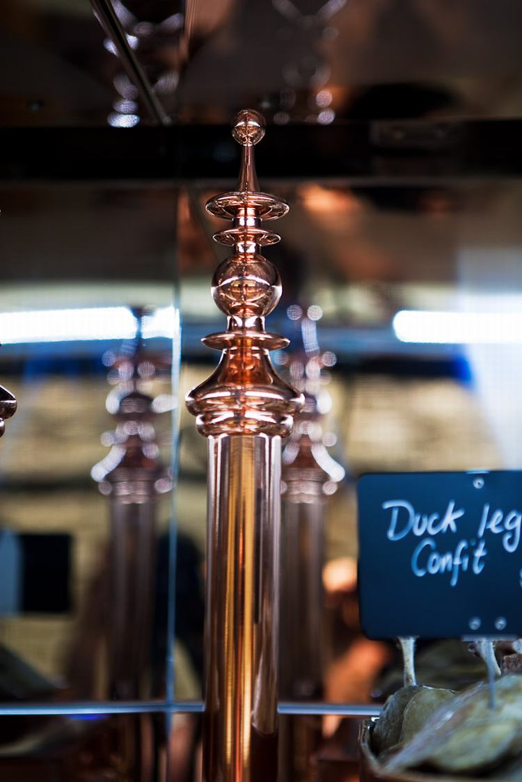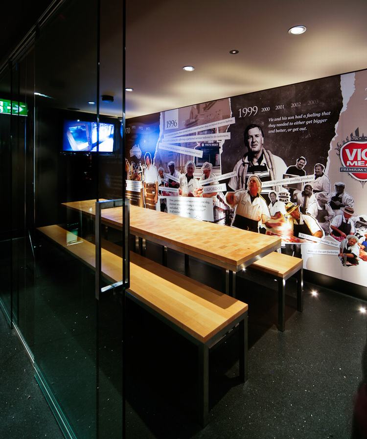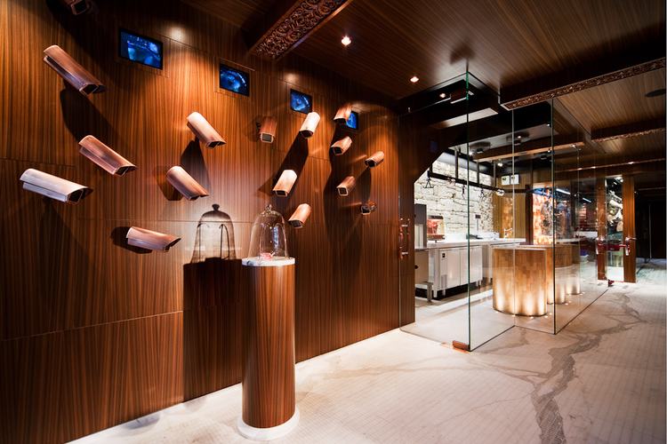 一进门,顾客就会被热情、娇宠而迷人的商店迎接。丰富的木墙镶板、木横梁天花板和意大利卡拉卡塔大理石石板地板,石板切割成马赛克瓷砖,然后重新铺设,在澳大利亚首创的定制的弯曲大理石墙装置构成了室内的基础。天花板横梁和柜台前的特点是手工雕刻的铜雕花。(如果梁在厨房玻璃墙的另一侧,但其纹路违反了食品卫生标准,那么同样的纹路图案也用丝网印在木饰面上,以保持屠宰/厨房区域的外观。)