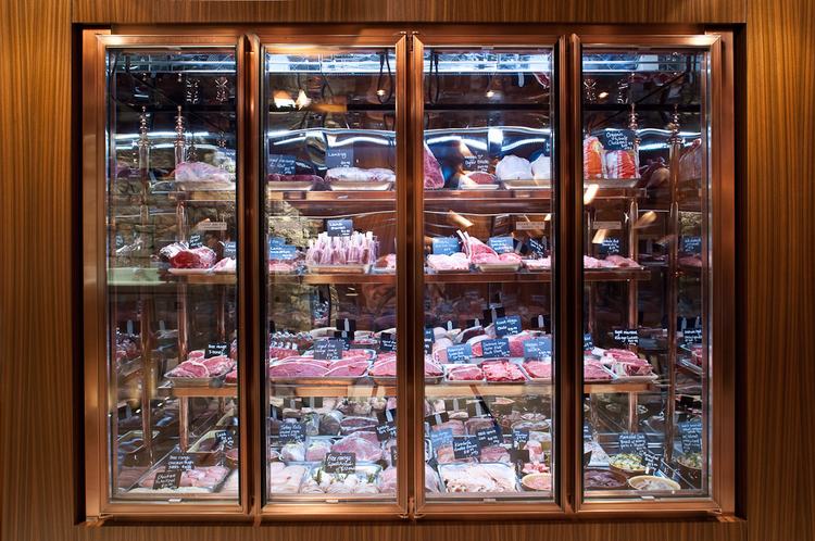 涂有木材的衬砌街道前立面具有透明的双层玻璃冷藏玻璃柜,使过路人都能从令人惊叹的定制铜和玻璃架子上看到不断变化的悬挂肉类和家禽,以及放置在架子上的物品。照明采用冷色光源,客户除了可以观看产品之外,还可以查看商店介绍。