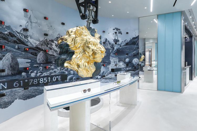 在入口处,迎接购物者的是一个移动装置,上面有一个牧童的雕像,显然是在打瞌睡,背景是科幻图像。Gentle Monster眼镜点缀在展览中,但也在架子两侧的安装。在地面上描绘的梦幻田园场景引出了第二个装置,其标志是一个镀金的狮头。除了该品牌最近与演员吴亦凡(Kris Wu)推出的合作系列之外,这家新开的(Gentle Monster)商店还销售全系列的眼镜。