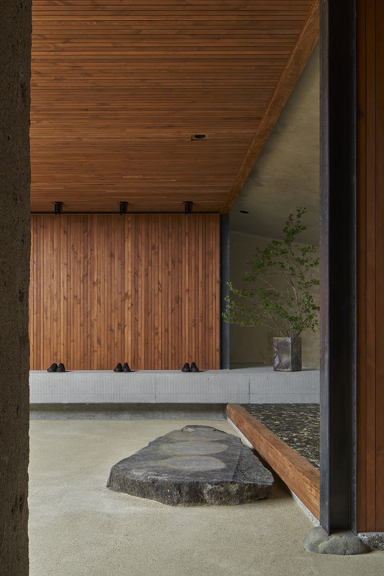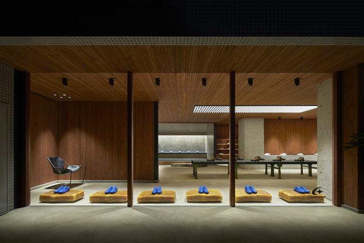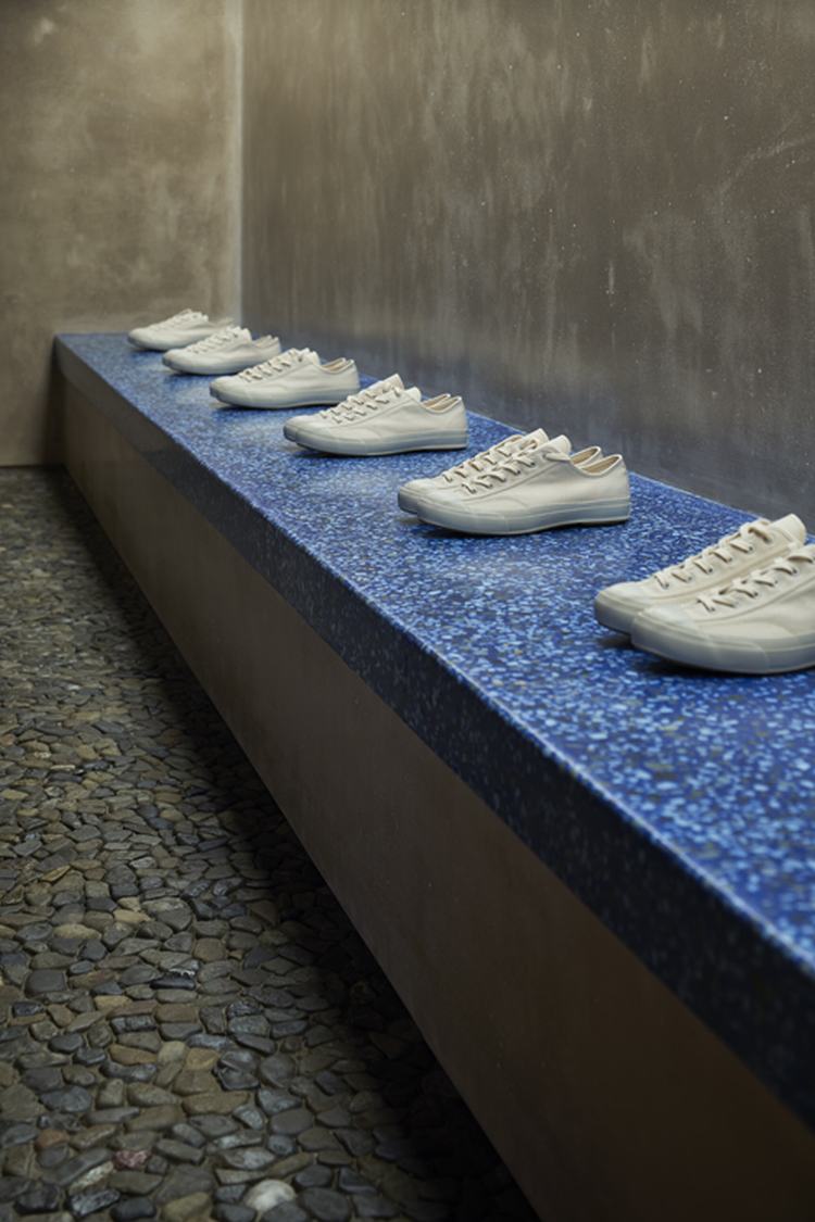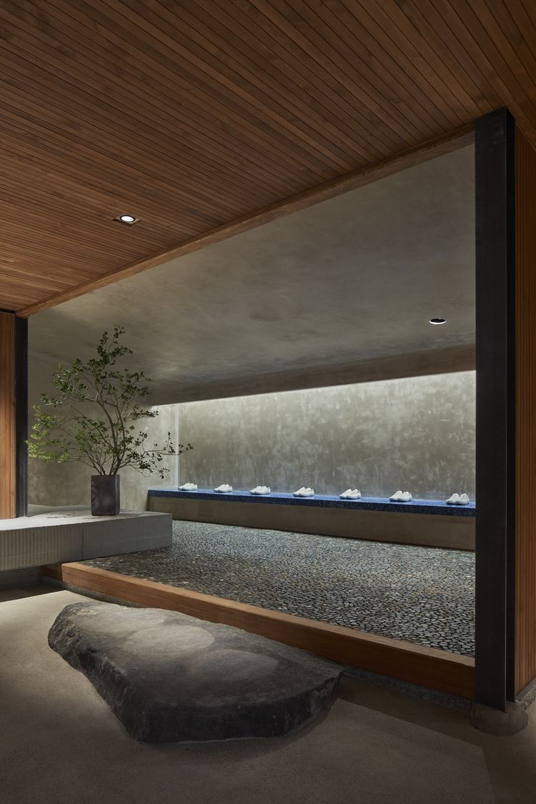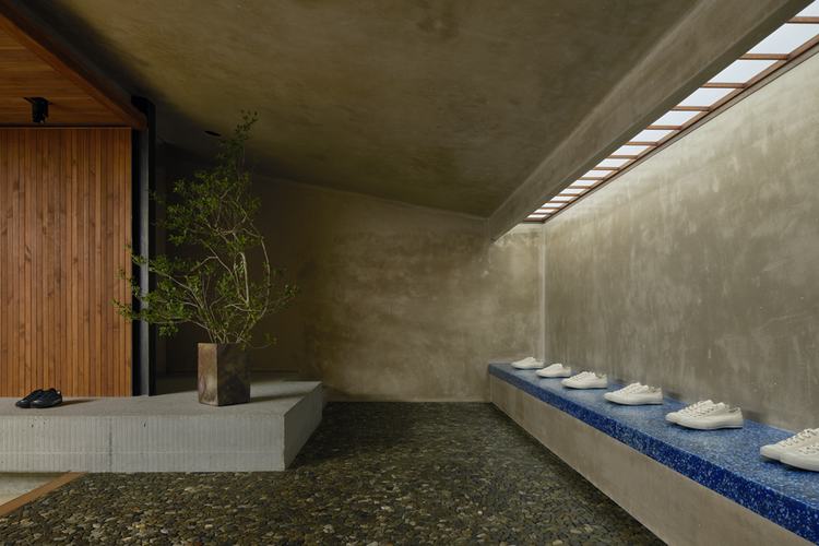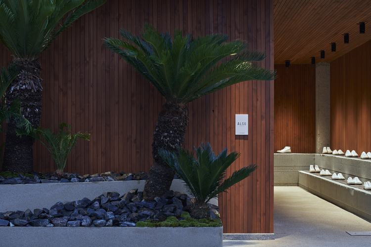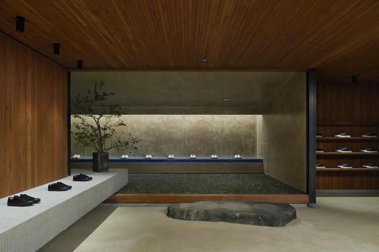 moonstar工厂的碎片被转化为纹理、表面和商店内的家具,比如滚筒输送机,它变成了鞋子的展示台。利用木匠、泥瓦工和园丁的技术,日本建筑师重新诠释了moonstar在空间内真诚的工艺。几种材料结合在一起,包括木材、石头、石膏和混凝土,所有这些都是由工匠花费时间和精力创造出来的。