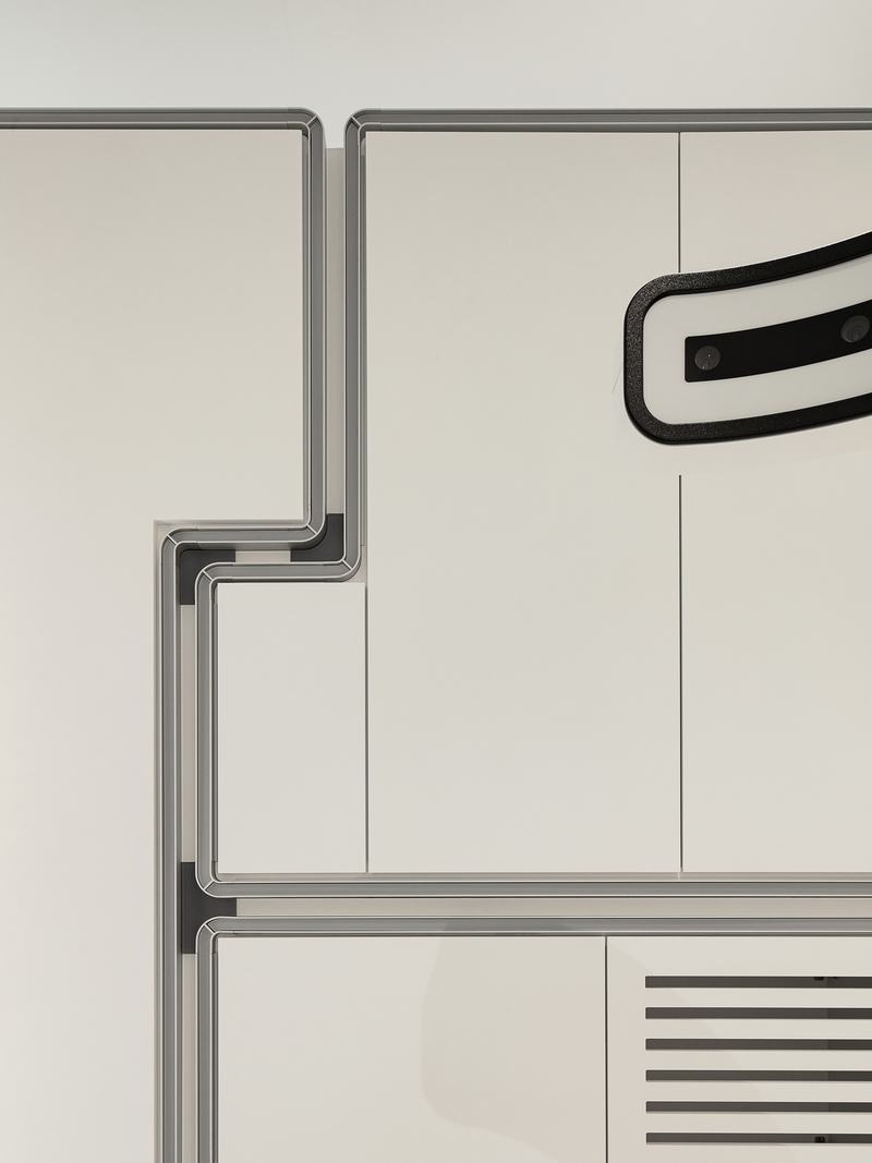 墙壁的模块化组成主要是3T铝框架。每个框架由20T丙烯酸树脂组成。整体材料表面处理为有组织的模块化系统增添了柔和,温暖的氛围。