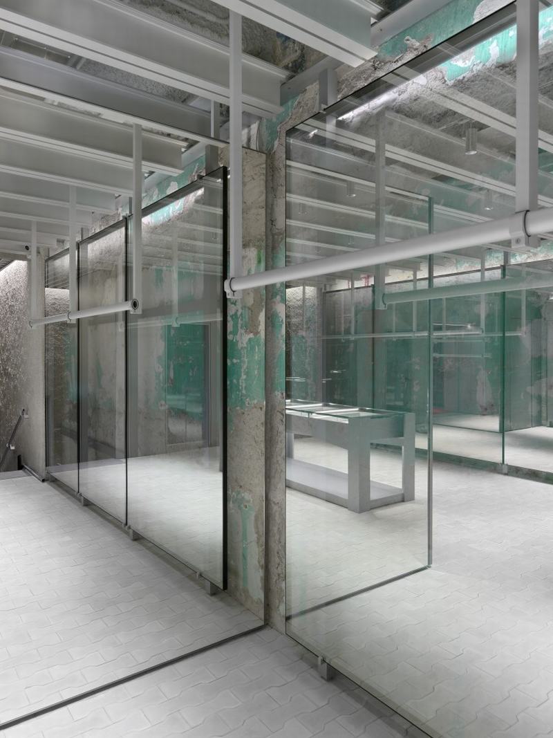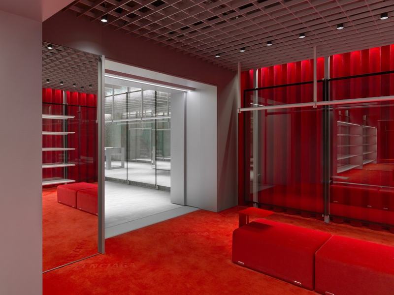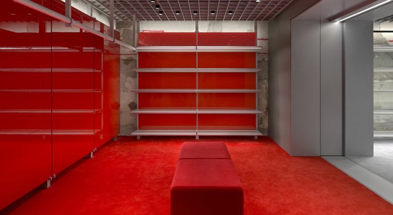 面对街道的玻璃门和窗户向内弯曲,创造了凸面空间,从外部展示了商店内部更广阔的视野。在里面,房间彼此敞开,每一个都是之前的主题的变化。每个房间的地板都是由各种编码的纹理制成的:类似沥青的混凝土瓷砖,水泥灰色和夸张的红色的刻有标志的地毯。
