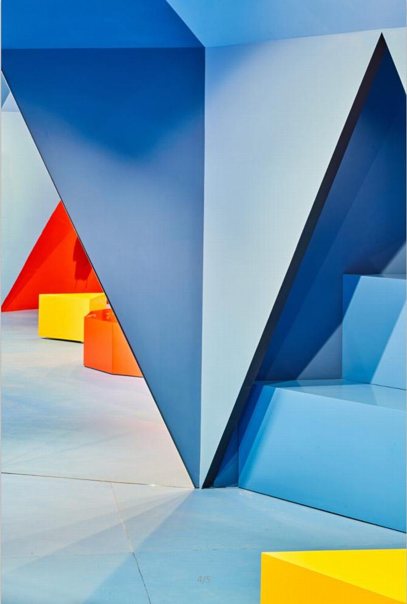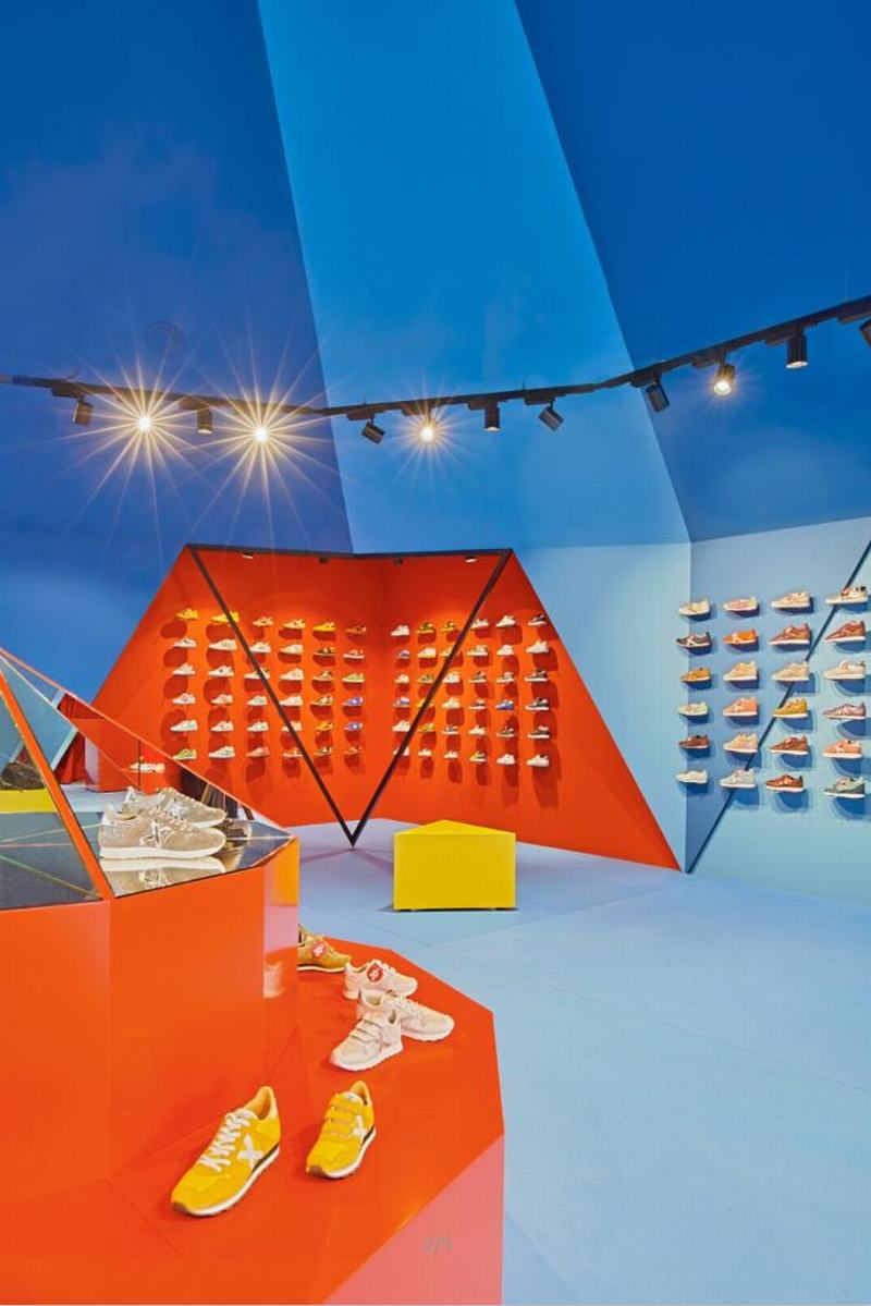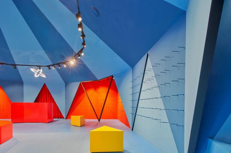 入口两侧的角落有壁龛,展示包和配件。一件十二面家具占据了中心舞台,展示了该品牌最新发布的产品,同时以多种方式反映了覆盖它的金字塔。其他陈设包括具有类似色调的销售柜台和对比鲜明的黄色的三角形座椅。