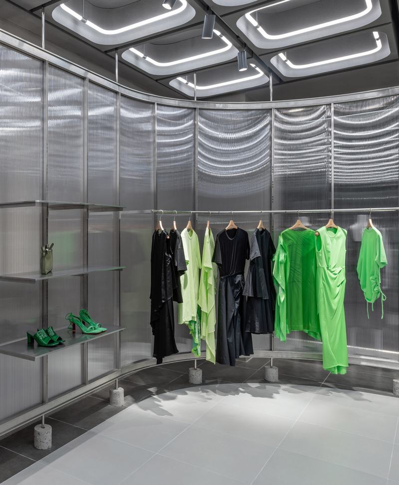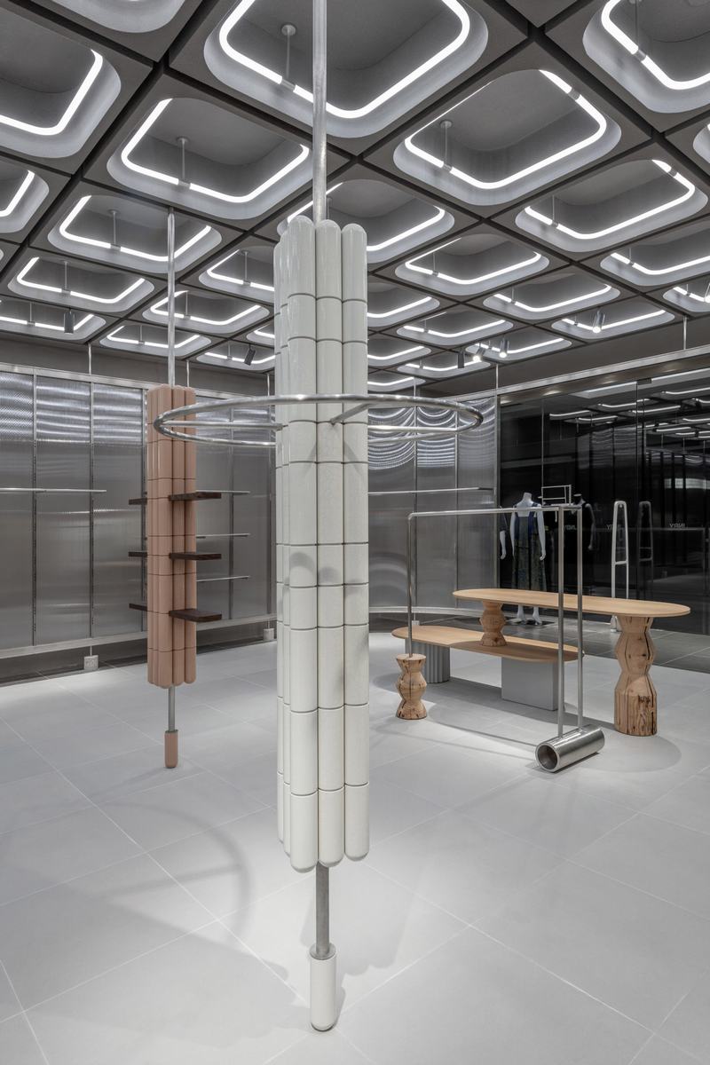 一对陶瓷陈列架打破了空间的序列,展架是由从地板延伸到天花板的钢柱包裹凸瓷砖形成。一些展台已经安装了可以挂衣服的金属环,而其他展台则设有可以摆放配件的小架子。