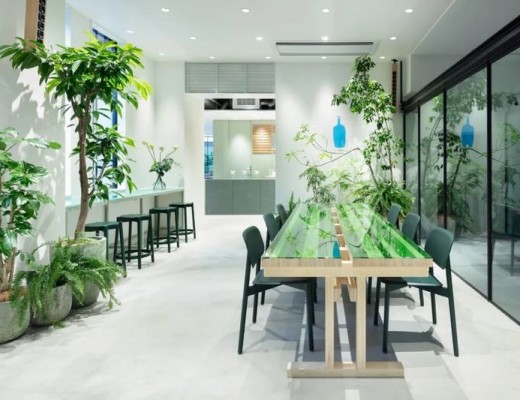 100平方米的商店的天花板覆盖着定制的混泥土模型吊顶。每一组混泥土模块中,都有一组LED灯条。瓦楞玻璃面板在弧形钢框架的包裹下环绕着空间的外围,与结构墙隔开。由再生混凝土铺装而成的粗圆柱形砌块使隔断保持平衡。
