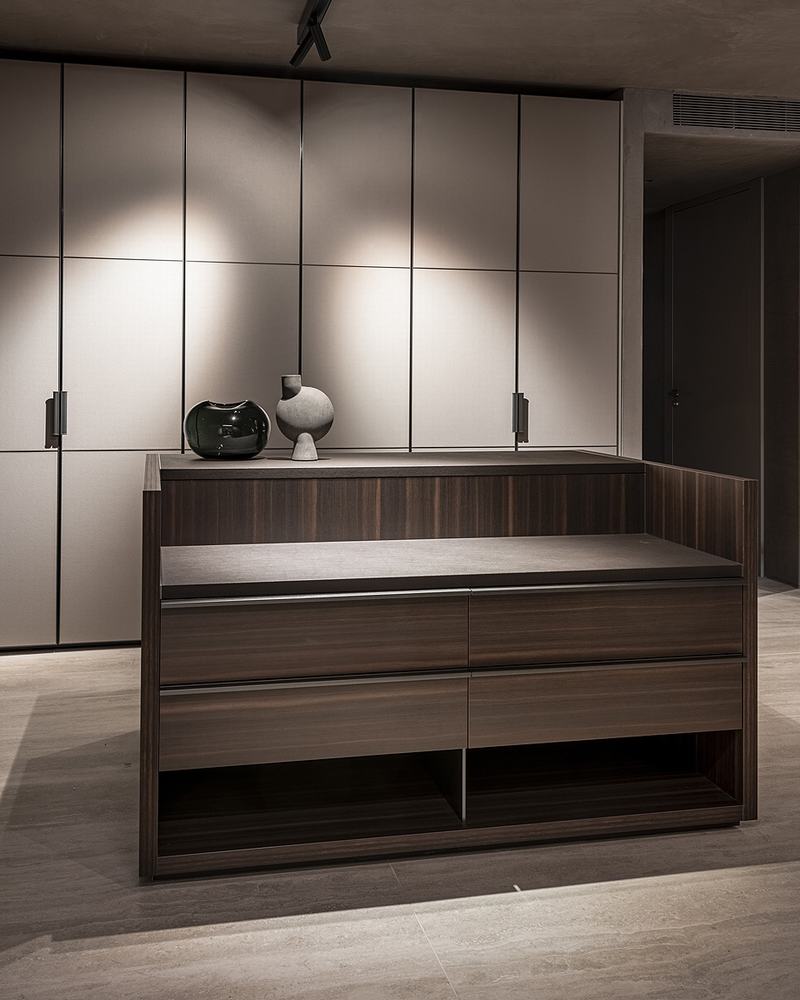 Checker是基于一个开放的植物概念,为大空间设计,使用正式的,冷静的和基本的设计语言。天然木材、独特的漆器和背面涂有纹理的玻璃与天然石材台面相结合。LED照明,在墙壁单元的底部和台面下,增强了家具的表面。