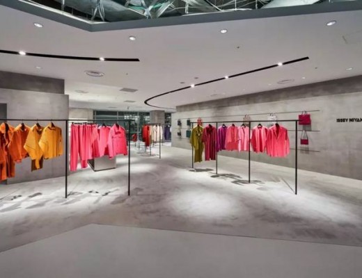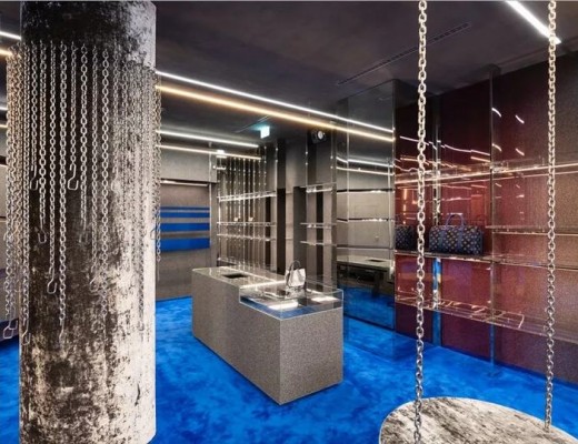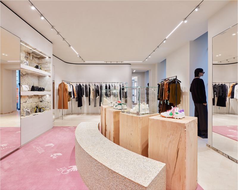 该店比大多数其他Off-White商店装饰上更加豪华,而且还嵌入了代表其男装和女装系列的标志性元素。一楼展示的是女士系列,凹陷的层架背面铺有大理石,与光滑的石灰华地板搭配,并铺有带有品牌徽标的粉红色软地毯。弯曲的墙角,光亮的钢制和玻璃制的陈列柜,许多对比鲜明的家具,进一步增强了布置的活泼现代感。