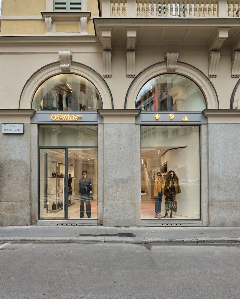 Off-White 最新旗舰店位于米兰,这是继La Rinascente百货商店之后,该品牌在该市的第二个零售空间。占地344平方米。它在一栋19世纪的建筑,位于比格里街(Via Bigli)和维里街(Via Verri)的拐角处,正处于著名的大教堂区(Duomo district)中央,周围是Etro、Iceberg、Jil Sander和亚历山大•麦昆(Alexander McQueen)等知名奢侈品牌的旗舰店。