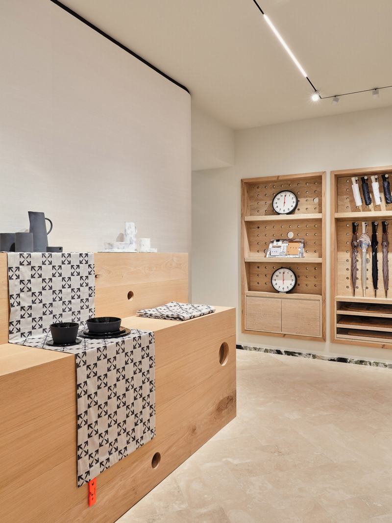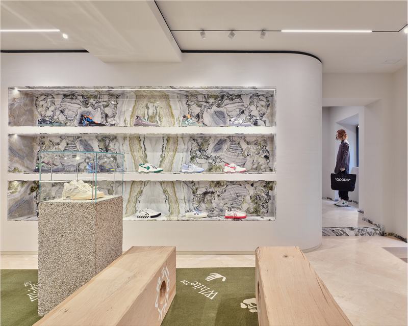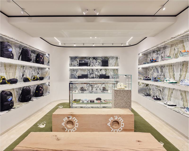 大块的石头陈列柜和长凳与坚固的木质陈列桌搭配使用,增加了意想不到的装饰元素。在一层楼上,是男士展示系列,具有相似但略有不同的布置美感。在这里,地毯呈绿色调,木制块用作座位,与另外一个房间的选定设计规范相结合,在该房间中展示了Off-White家居用品。