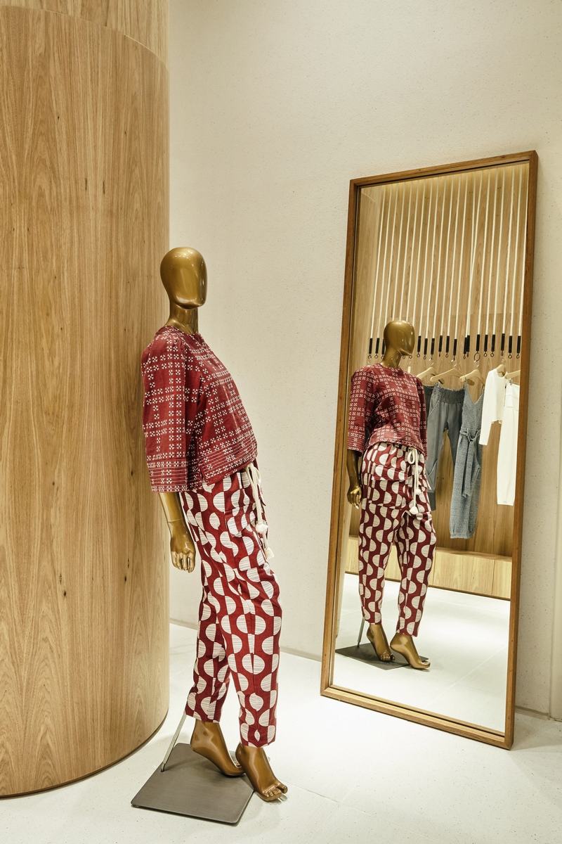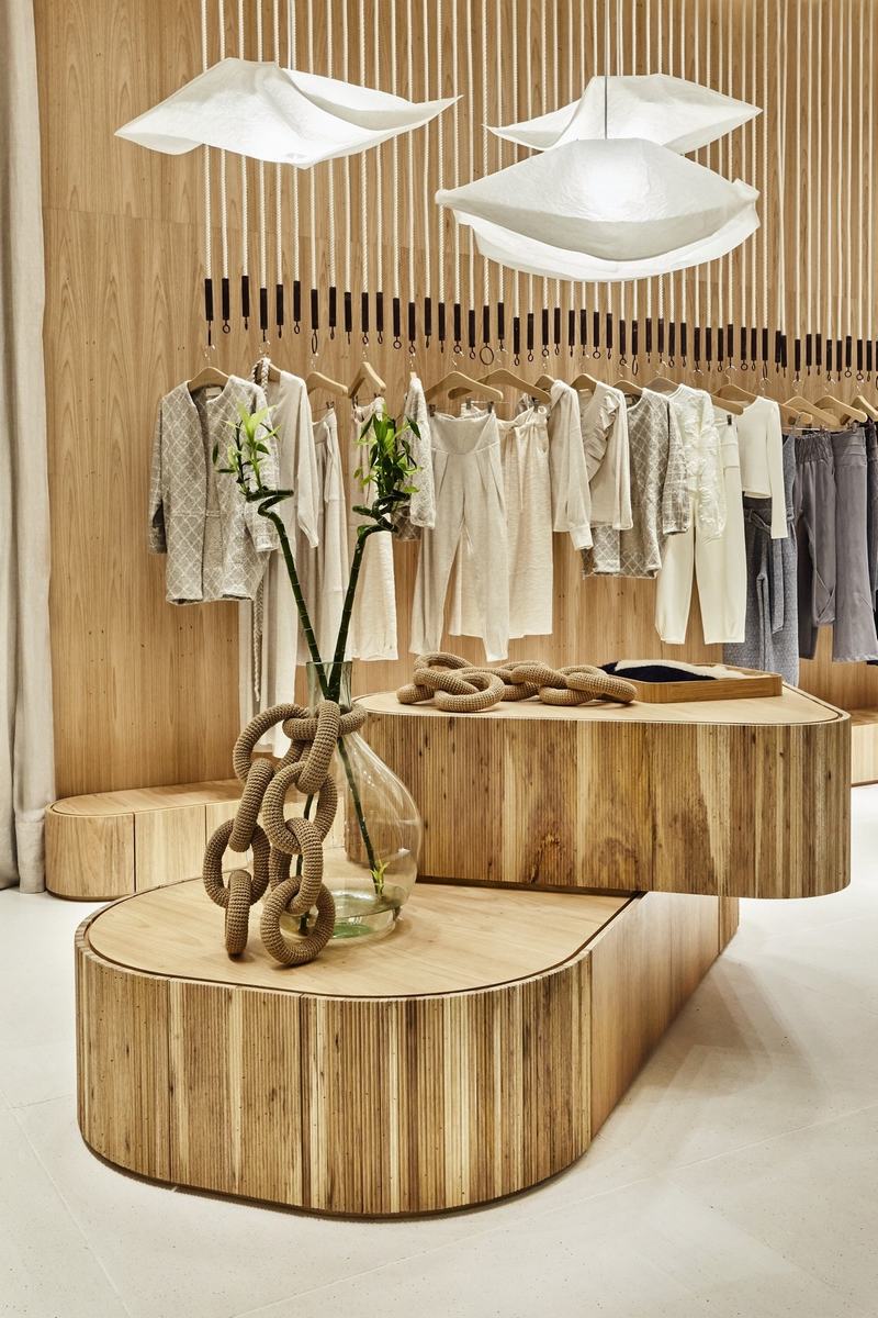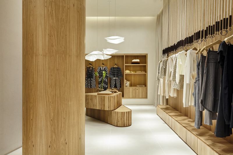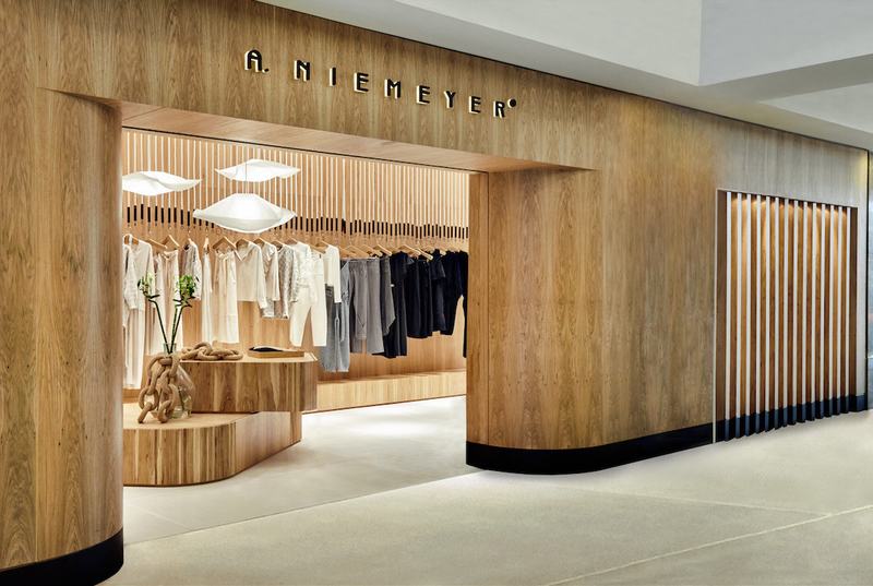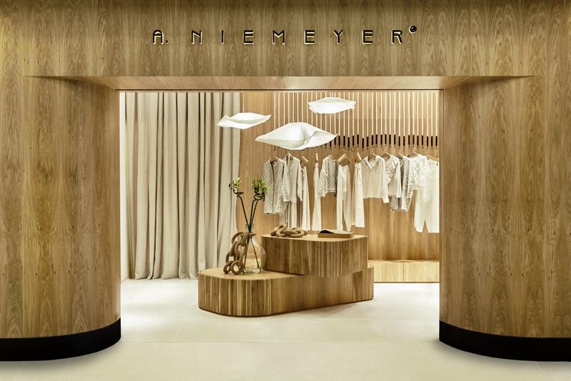 a . Niemeyer150平方米的商店向外“开放”,并沿着走廊吸引消费者的注意力,因为店铺立面和内部都是由自然认证的“freijo”木材(巴西胡桃木)制成。简单、极简的线条和雕塑般的曲线体块组成了店铺大型入口,而立面的一部分采用“遮阳板”设计,使人们可以看见内部。