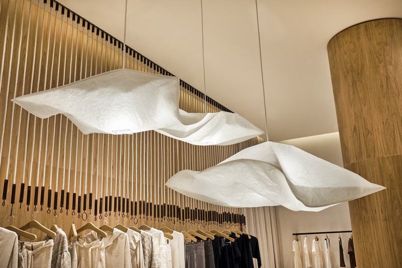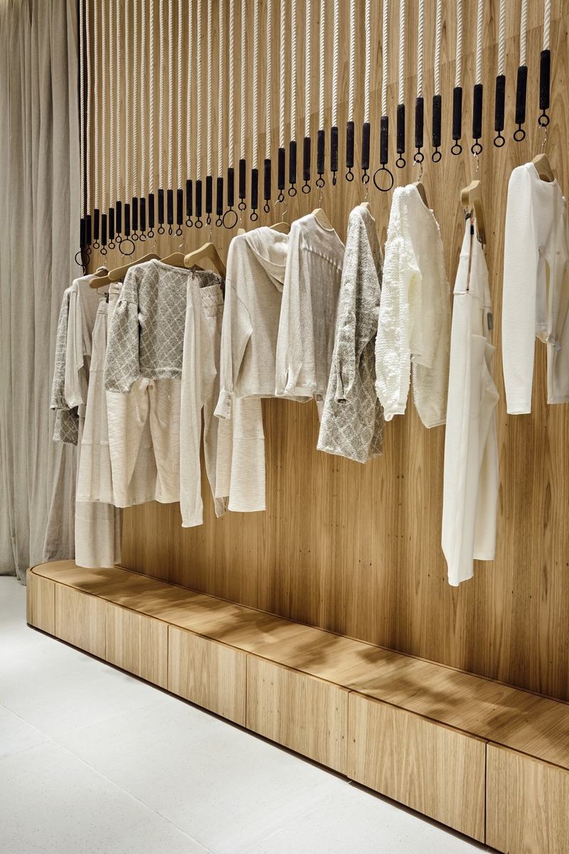 在店铺内,人们有一种置身于船上的感觉,“freijo”木材(巴西胡桃木)营造出的氛围,无论是在墙壁上还是在柱子上。中心是一个两体的曲面桌子,这是定制的“freijo”。受船上常见的铁艺影响,衣架由天然航海绳索和耐候钢配件组成。质朴的水磨石地板和纯亚麻窗帘与沙子有关,当代纸吊灯引人注目,犹如天上的云彩。