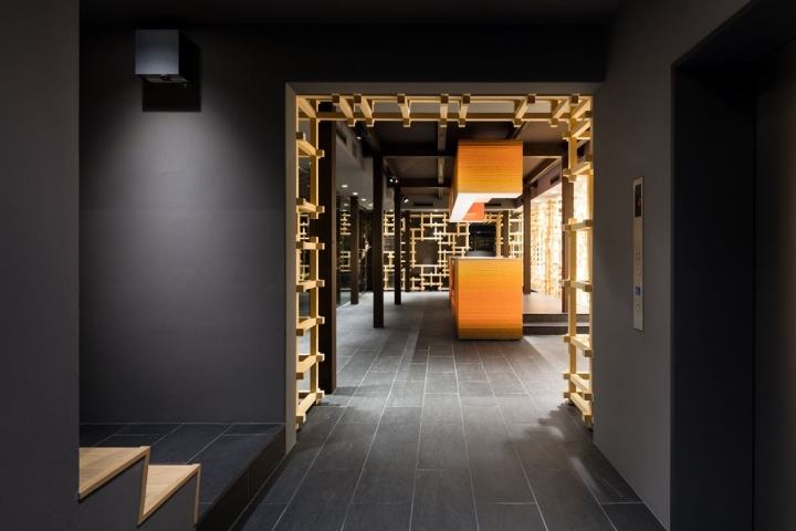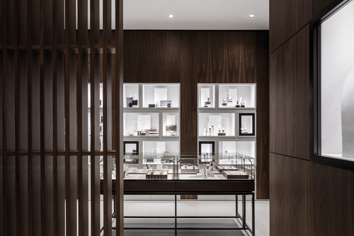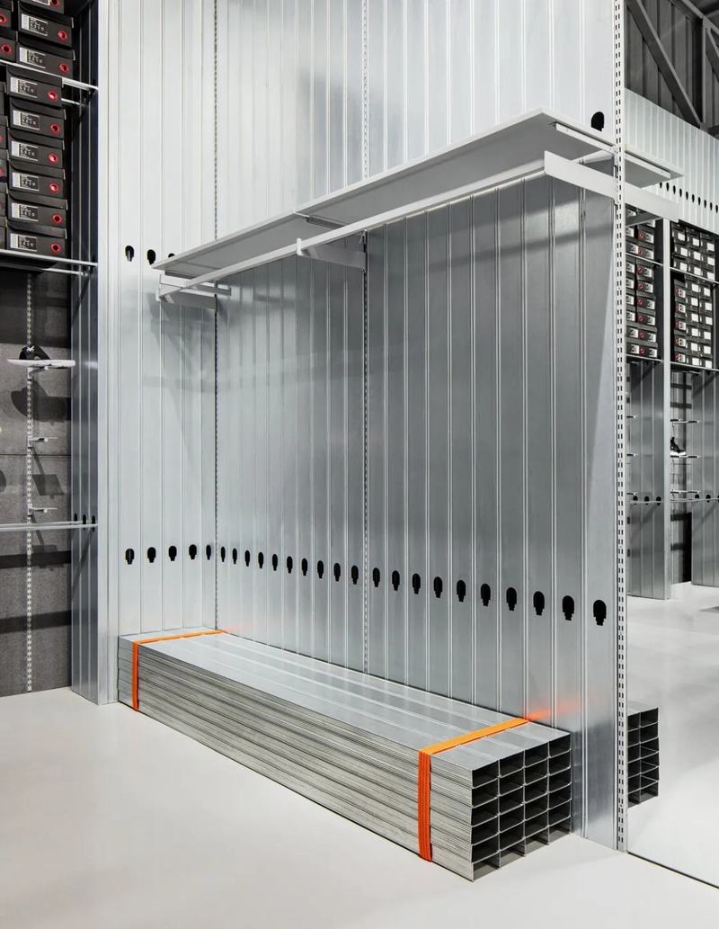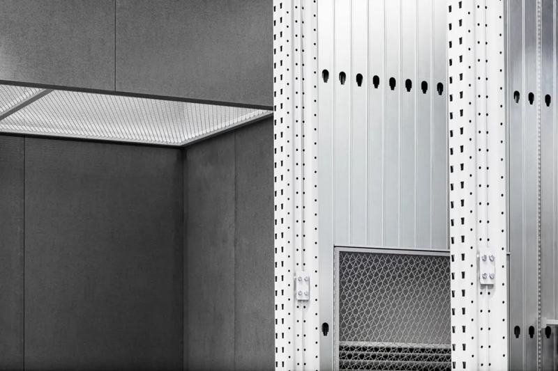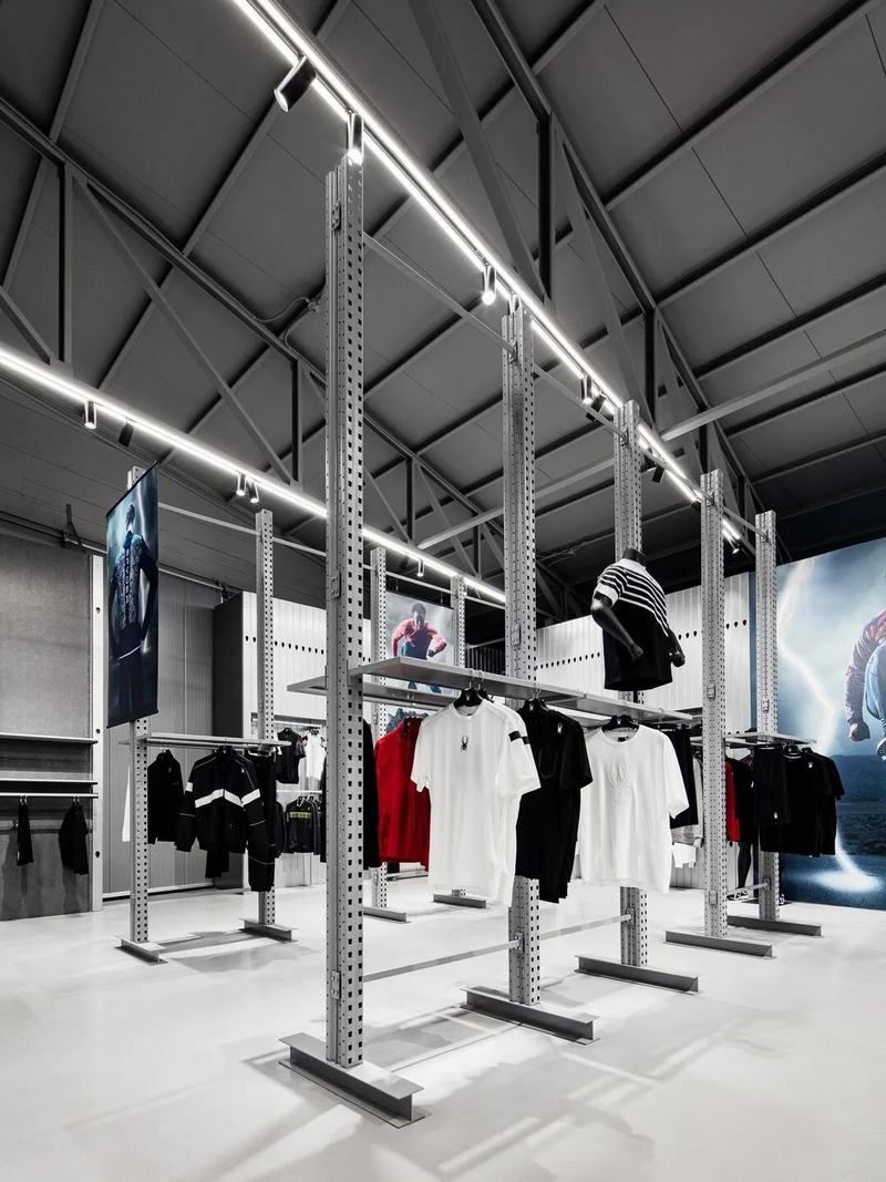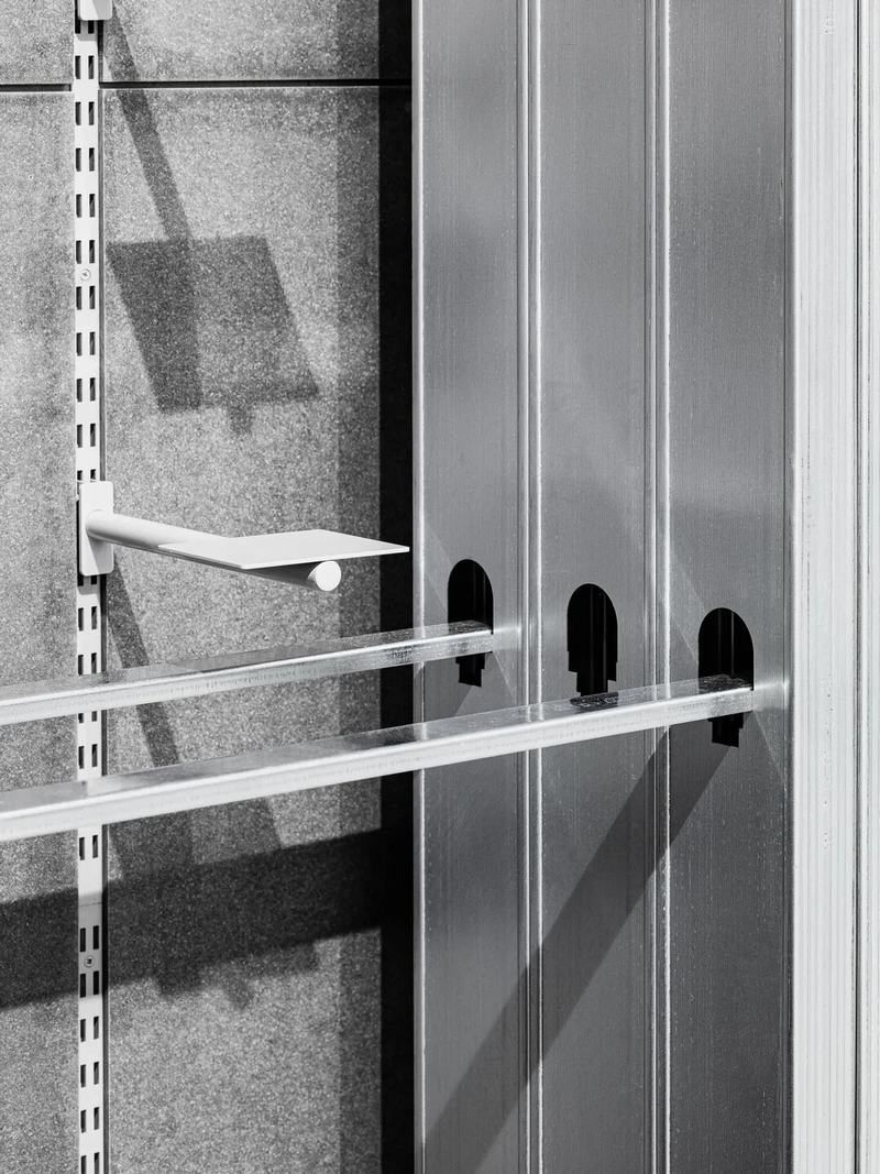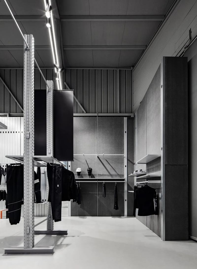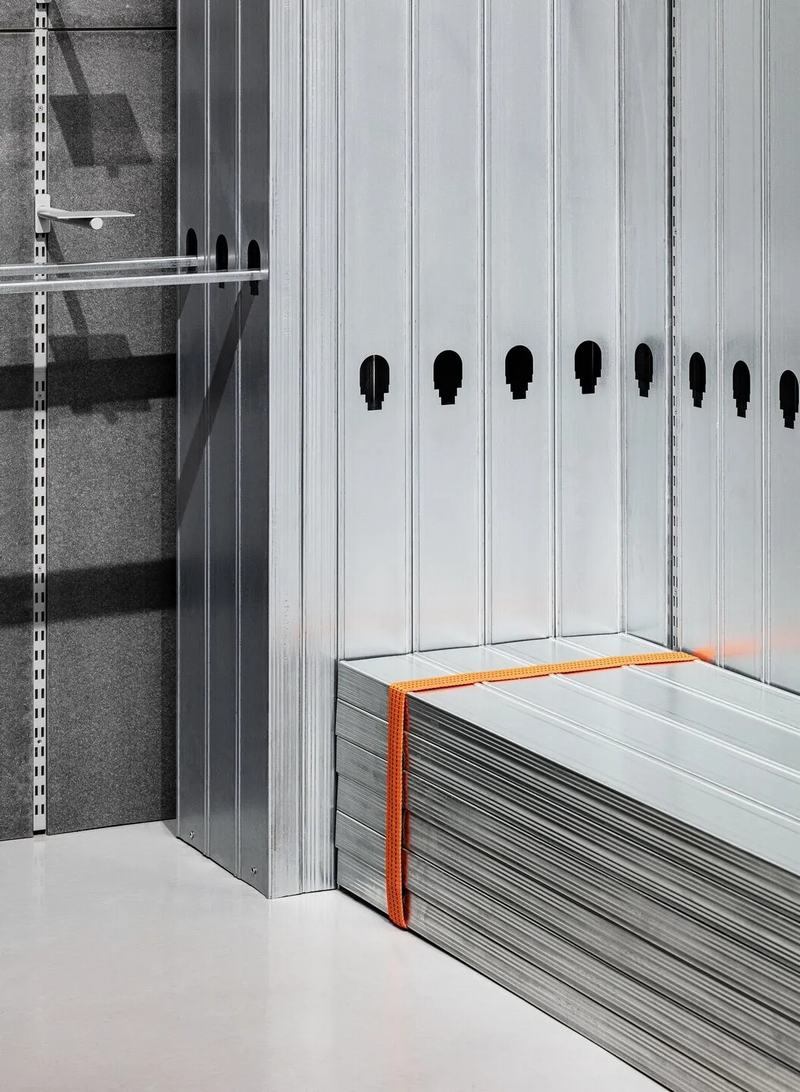 它使用螺柱作为出口的饰面材料,其主要目标是销售产品。人们可以通过垂直排列固定在墙上的螺柱获得粗糙空间的图像。他们可以根据需要灵活地使用墙壁,方法是定期在双头螺栓之间插入通道系统。它通过利用机架式家具的衣架设计实现了独特而强烈的形象。