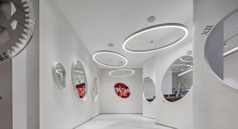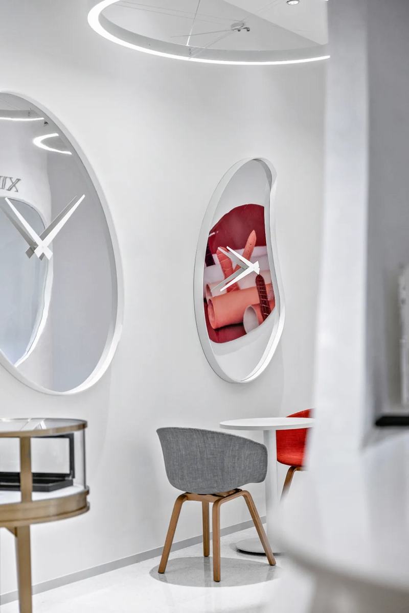 该空间通过大面积运用白色来展示“钟表诊所”般严谨、一流的态度和专业,以白色墙壁与来自天花板的光源为特征,把诚实,清洁,崭新和中立这类与白色有关的愿景写在设计中。