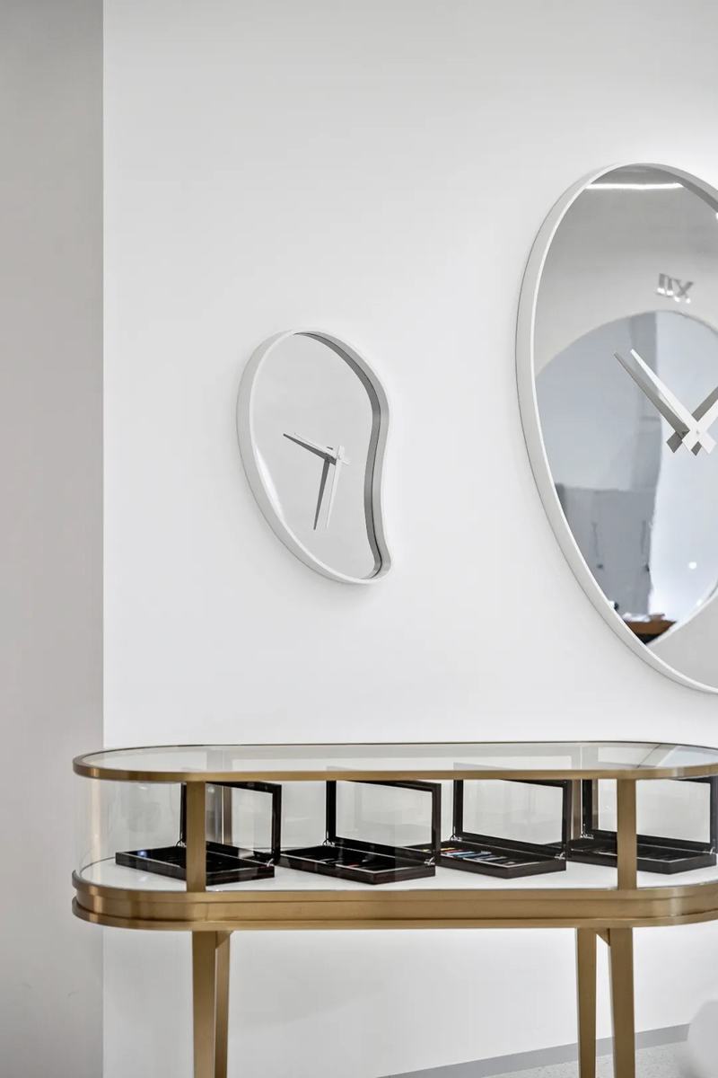 变形的开窗把整体空间一分为二,一侧是零售展示及顾客休息的空间,墙面上的不规则镜面表盘时间融化在指针和表盘中,象征的平静也焕发着新生。另一侧是维修师傅的工作台,大大的窗户可以让顾客随时看到维修师傅的操作细节,这也成为建立信任的一环,让消费者放下防备,与品牌成为朋友。