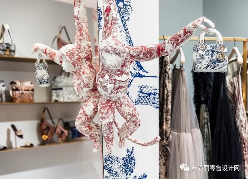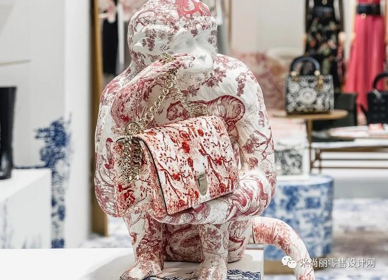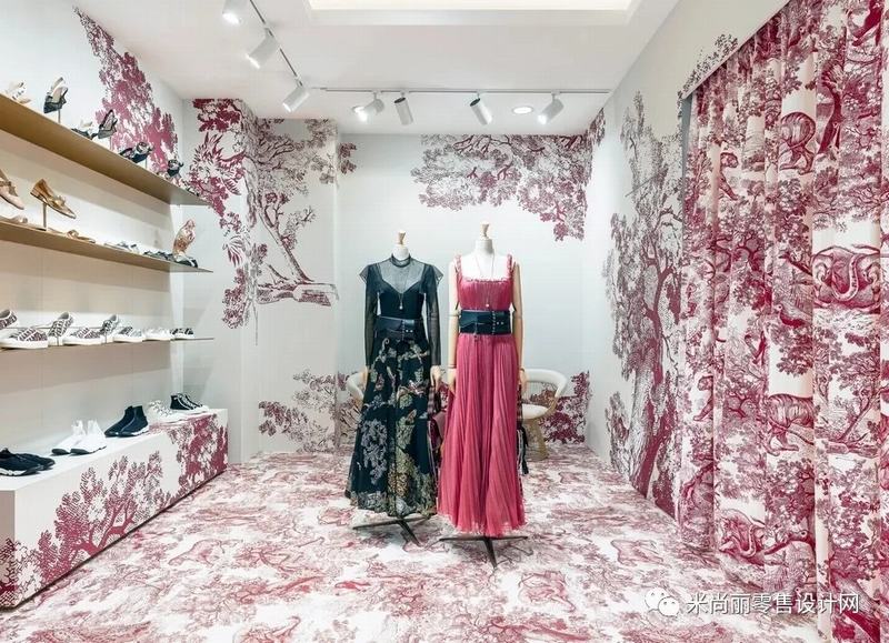 Toile的图案部分基本上是由单一颜色组成,我们最常见的是黑色,深红色或蓝色。绿色,棕色和洋红色的图案我们不太常见,但也不是闻所未闻。比如Toile最常用于室内装饰如窗帘,床品,特别是床罩,尽管浴室壁纸也很受欢迎。本次Dior快闪店就引入了,黑色,深红色或蓝色三种颜色。作为视觉的表达。空间装饰,服装、包、窗帘等都运用了“Toile de Jouy”图纹面料。