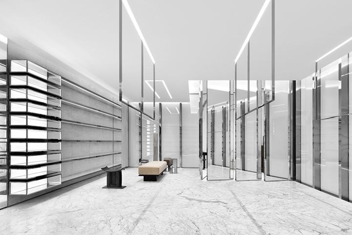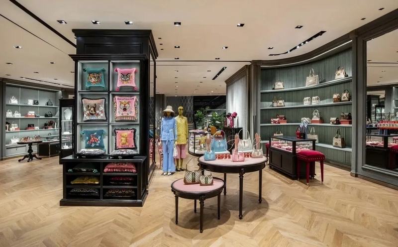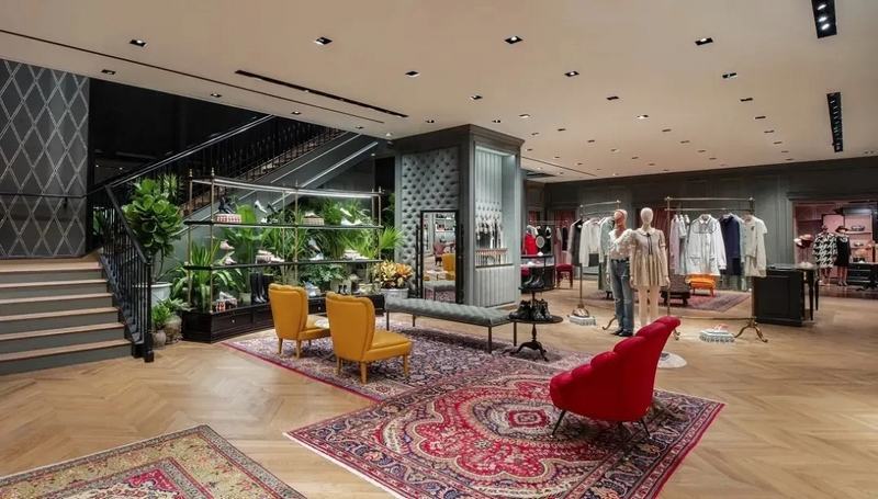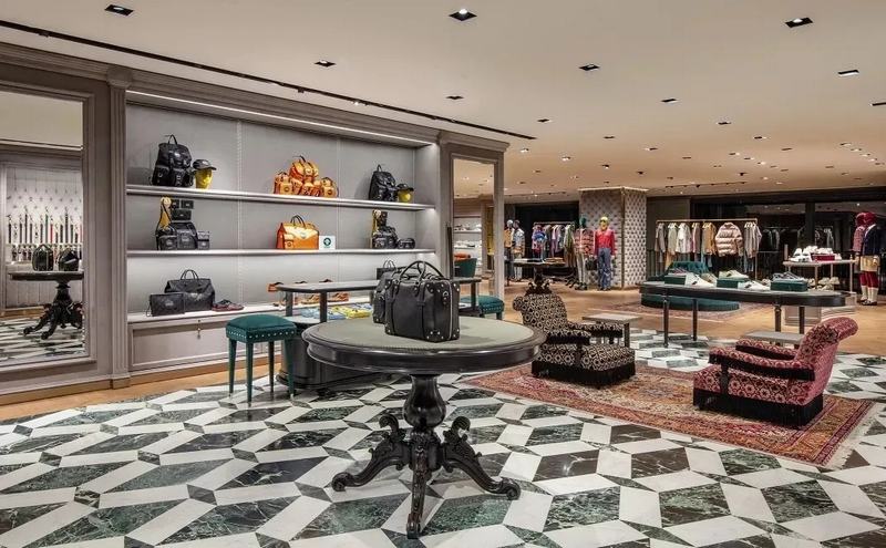 重装的古驰(Gucci)店铺设计上将传统与现代、工业与浪漫风格相结合,设计理念与亚力山卓∙米开理的美学视野遥相呼应,展现品牌优雅的现代折衷主义美学。重装的古驰(Gucci)店铺融合多元材质与设计元素,店铺里扶手椅与墙面选用精致优雅的天鹅绒并饰以硬朗的庞克风铆钉,呈献古驰(Gucci)品牌独树一帜的浪漫主义美学风格。空间中复古作旧的印花地毯、搭配当代艺术风格的几何图形大理石彩瓷,仿佛打破时空的界限。古驰(Gucci)店铺空间以冬日花园为灵感,错落有致的葱郁植物搭配玻璃外墙,处处散发着品牌生机与活力。