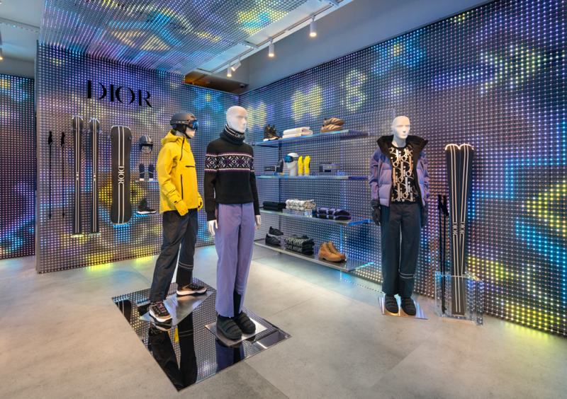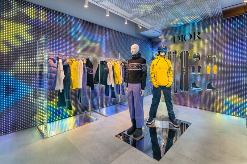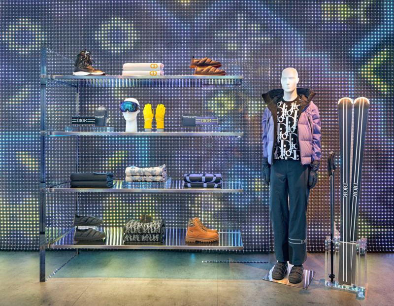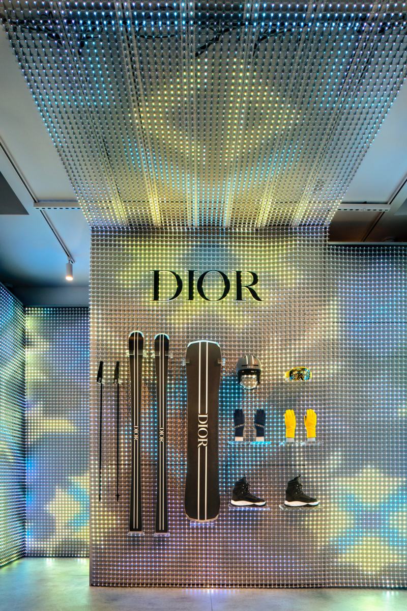 该系列中的各种产品陈列在拉丝金属搁板和透明导轨上,并带有镀铬细节,而装饰有Dior徽标的后墙则展示了令人垂涎的滑雪板,雪橇和相关配件。