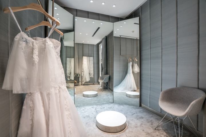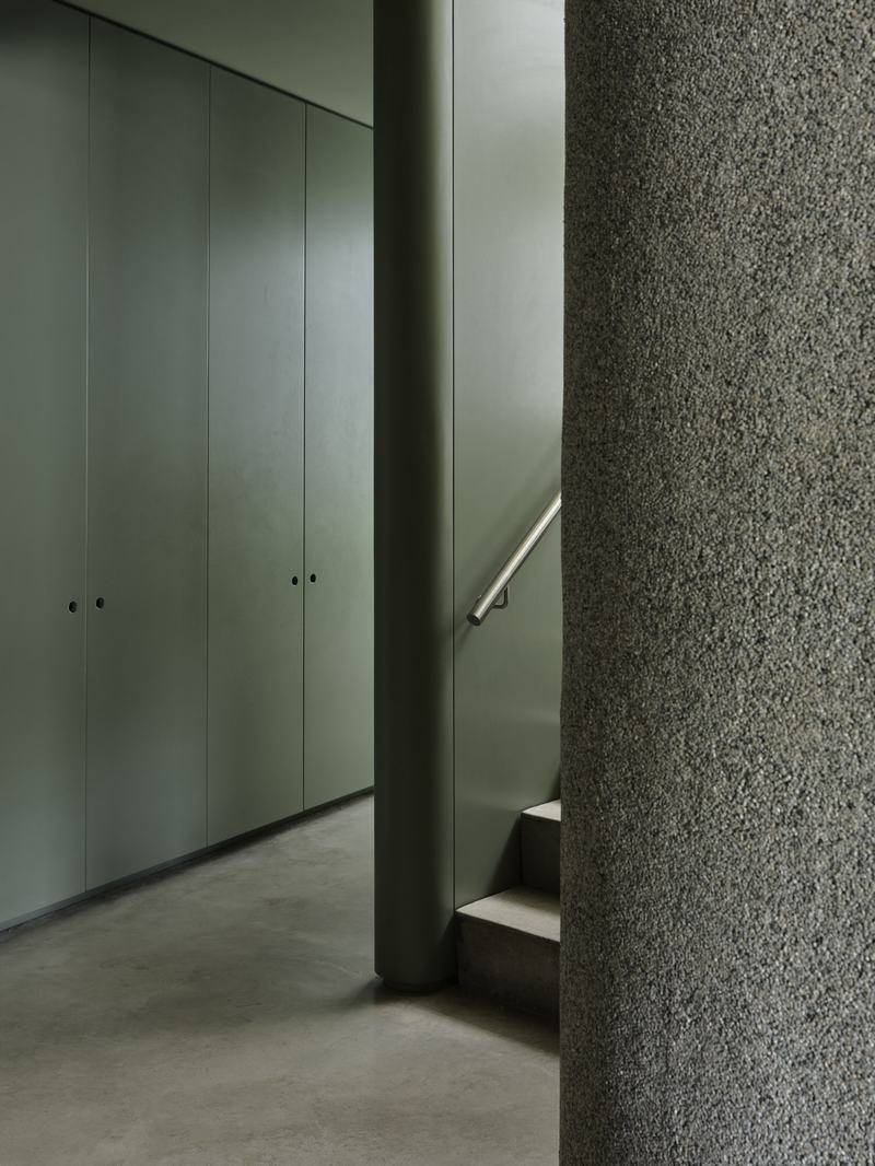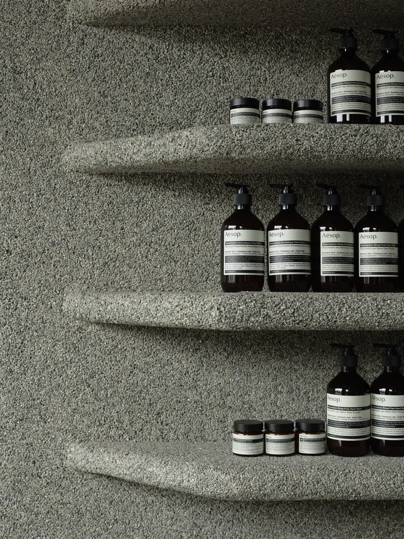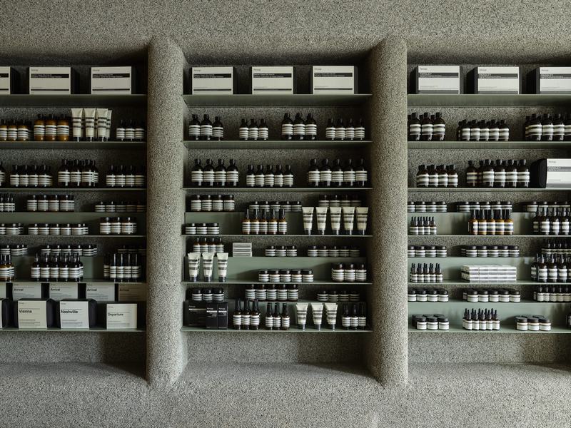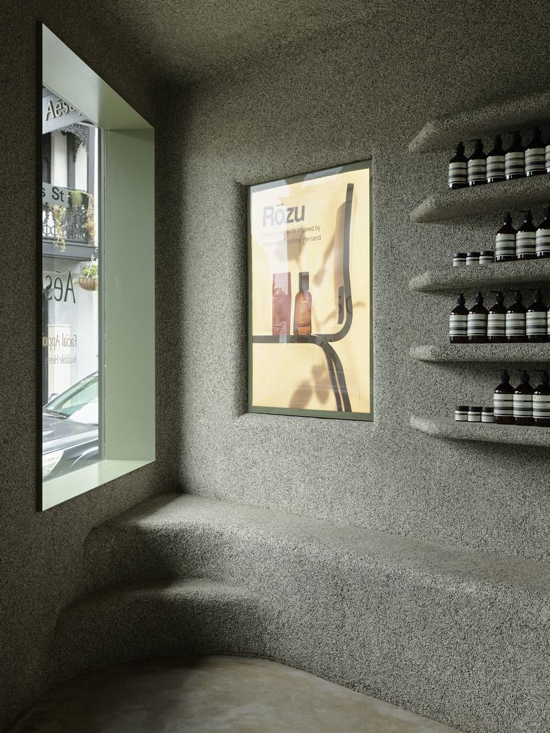 建筑师解释说:“每一种材料都被选择来表达一种特殊的地方感觉。”“内部是灰绿色的卵石混合,坚固的颗粒表面唤起了岩石海岸线。”灰绿色的鹅卵石排列在内墙和天花板上,就好像商店是一个倒置的游泳池,营造出一种身临其境的体验。座椅呈现出轮廓分明的泳池台阶;凹角和凹龛使人联想到海岸线上的洞穴;甘美的绿叶从深处喷涌而出。