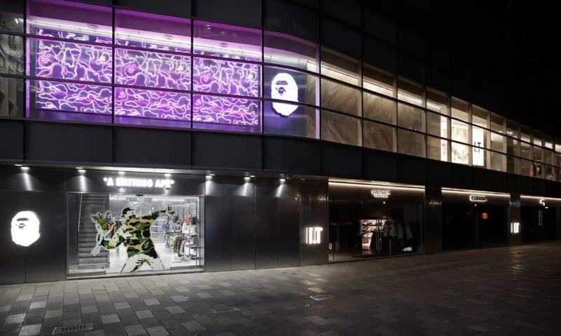 上海新天地 BAPE STORE® 专门店以充满前卫设计和未来科技感的崭新面貌打造。二层沿街外立面通过创新科技,首次呈现可持续变色 LED 迷彩霓虹灯设计,BAPE STORE® 签名式迷彩霓虹灯在此交相辉映,营造充满科幻色彩的空间氛围。