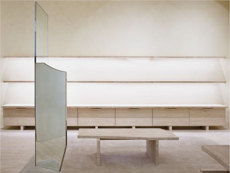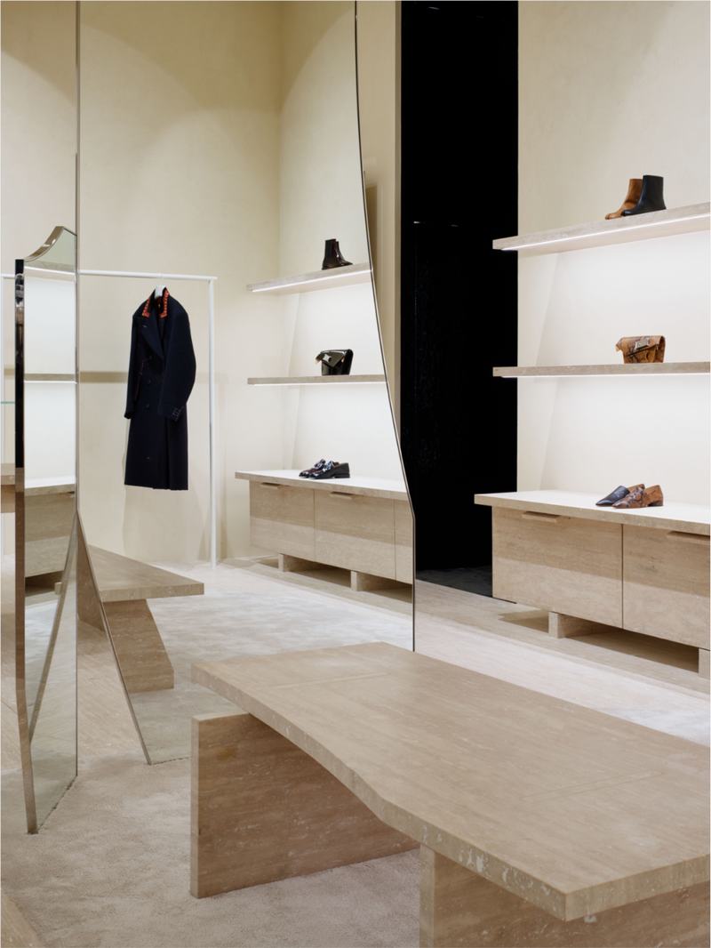 Misfit家具是在对经典物件的记忆中设计的,但在形式上被解构。装饰技术应用于用石灰华雕刻的架子、展示桌子和座位,而自然凹痕则填充了色彩对比鲜明的光学白色环氧树脂。与之形成鲜明对比的是,试衣间的天花板和墙壁被涂成深绿色的高光色,几乎是黑色,参考了日本漆柜。