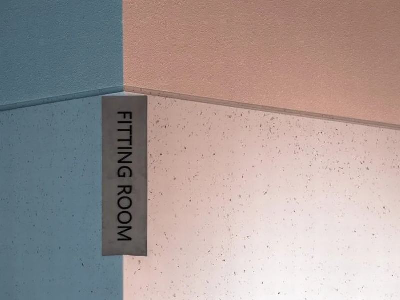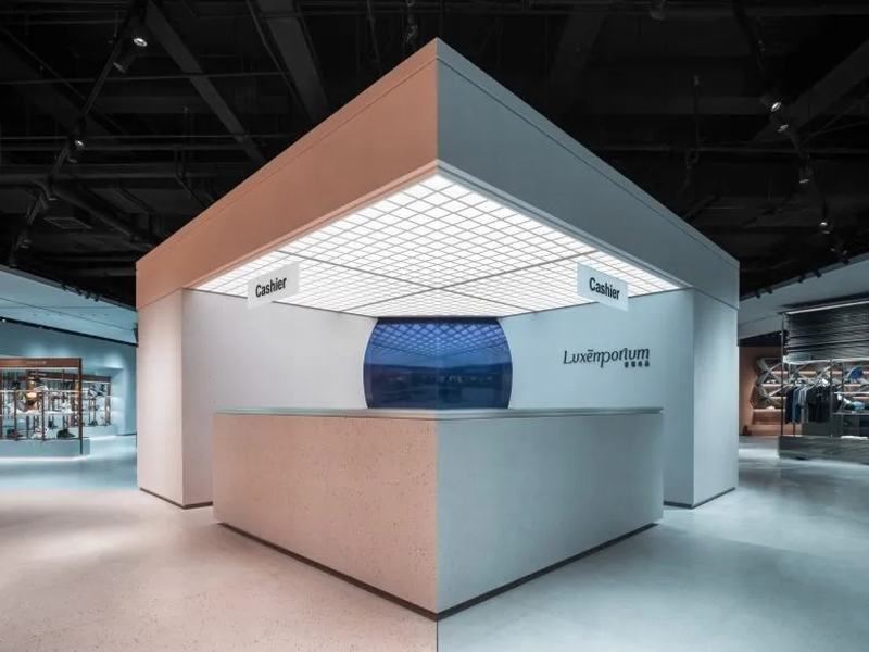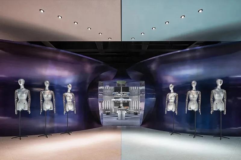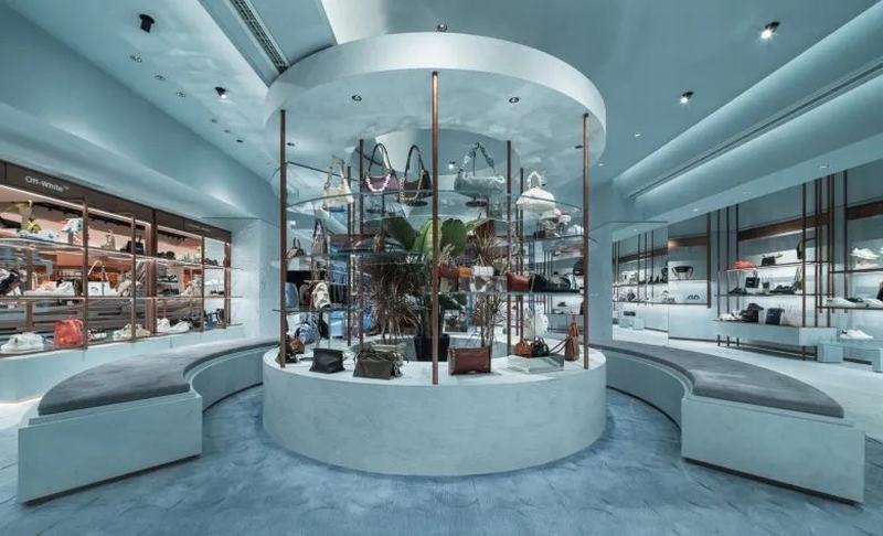 设计师们设计了一个蓝色区域,在这里展出了最畅销的精品系列。此外,还安装了多种展示结构来展示时尚产品,包括网格龛系统和一系列圆形展示架。