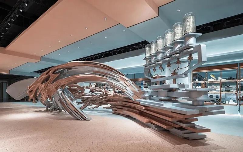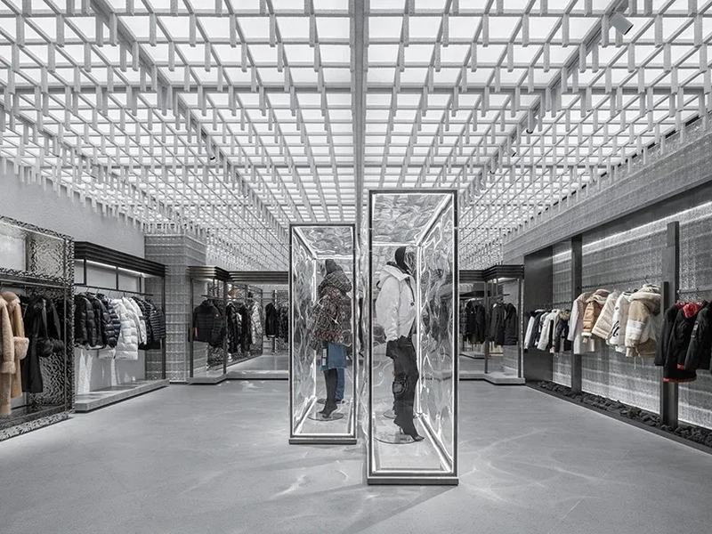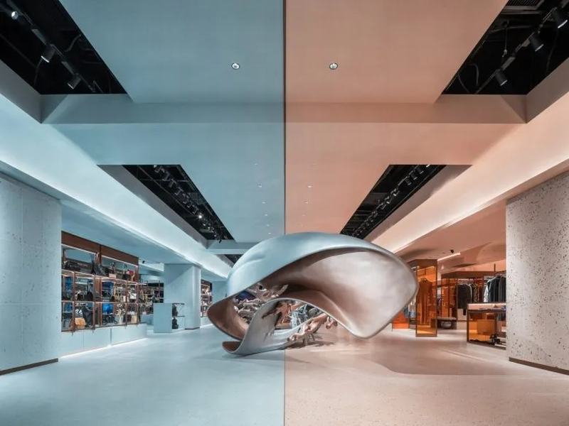 ALL Design Studio采用了一系列的金属、反光元素,以产生沉浸式的室内效果。此外,在精品店内部,平行线从下往上延伸,创造了两个平行世界的感觉,它们彼此相邻。