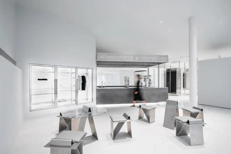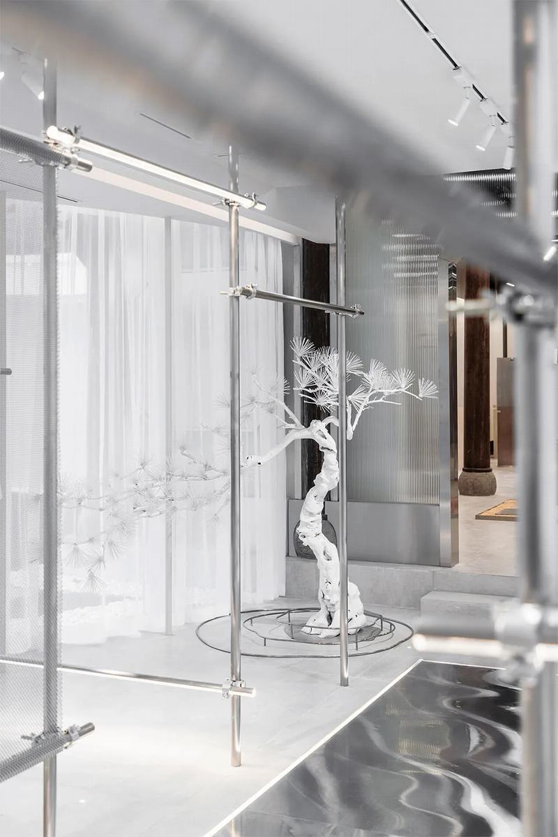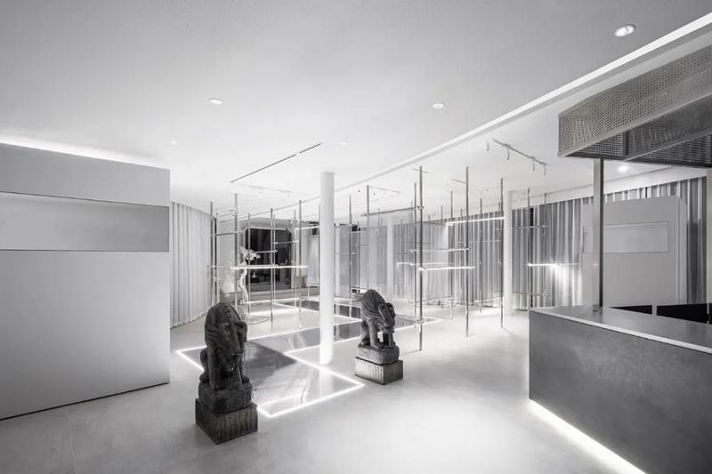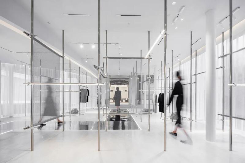 走进第一个主题零售空间,“金属竹林”充分感受现代蜀(四川地域文化)魅力。将金属杆伸入道具系统的主要组成部分,形成一套具有弹性紧固件和横杆的完整零售道具系统。隐藏的迷雾系统能很好地扩展和放大光影的变化,使货物在烟雾的阴影下有一种潮流感和神秘感。