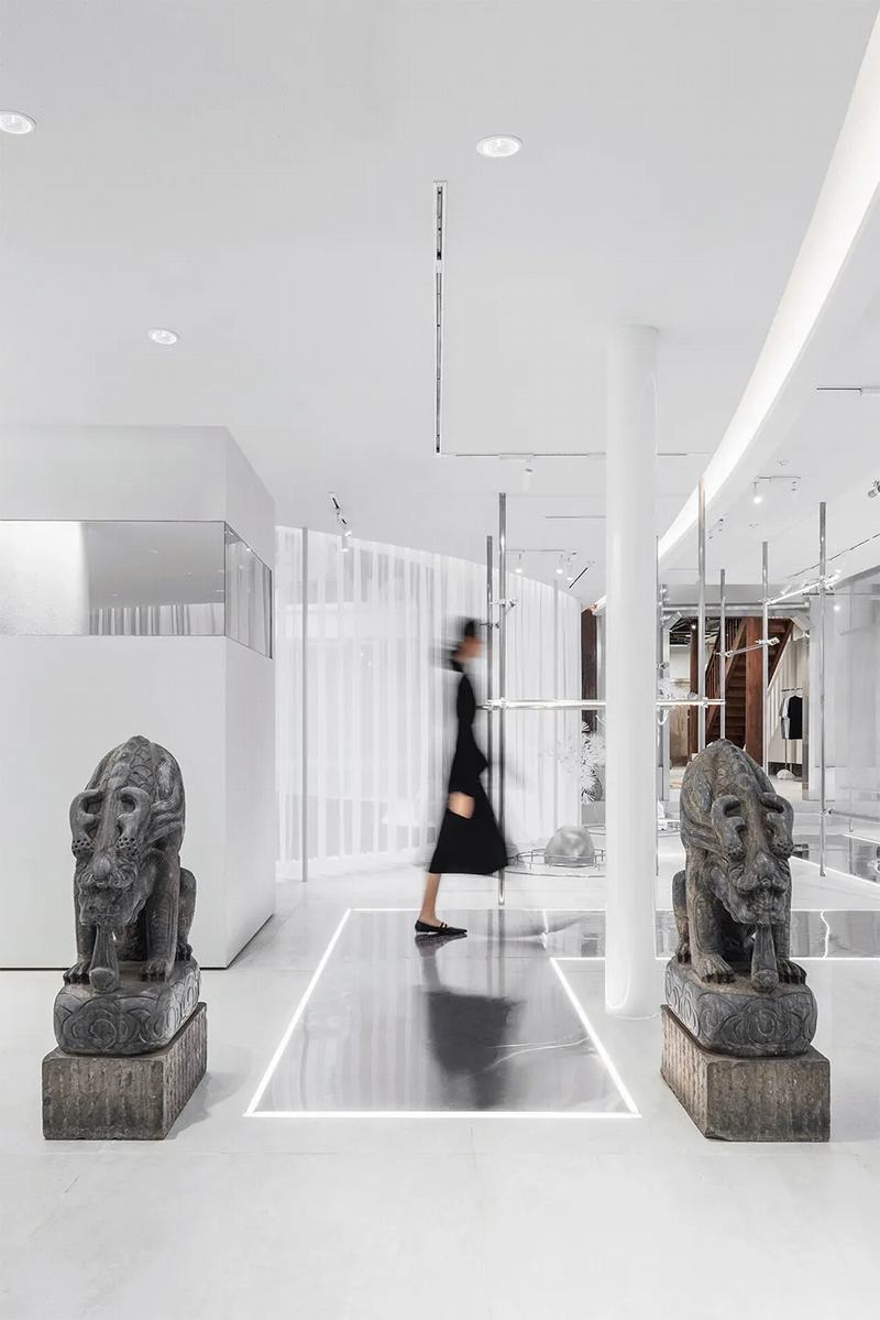 穿过“竹林”,进入古建筑内的零售空间,放弃复杂的色彩和多余的装饰,保持克制和谦虚的态度,在木结构的原始空间中添加功能性展示道具,并互相衬托 用大块表面的纯白色调和红棕色木色来诠释东方文化中“布白之奇、笔墨之简”的景象。