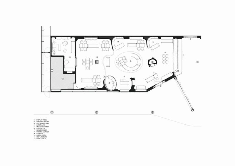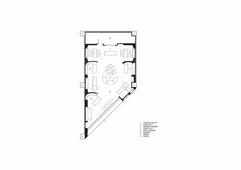 IF根据标志的独特弧线开发了内部平面图,提供了空间的连续流动,包括折叠和弯曲的弧形墙,这些弧形墙确定了商店的功能性转角。