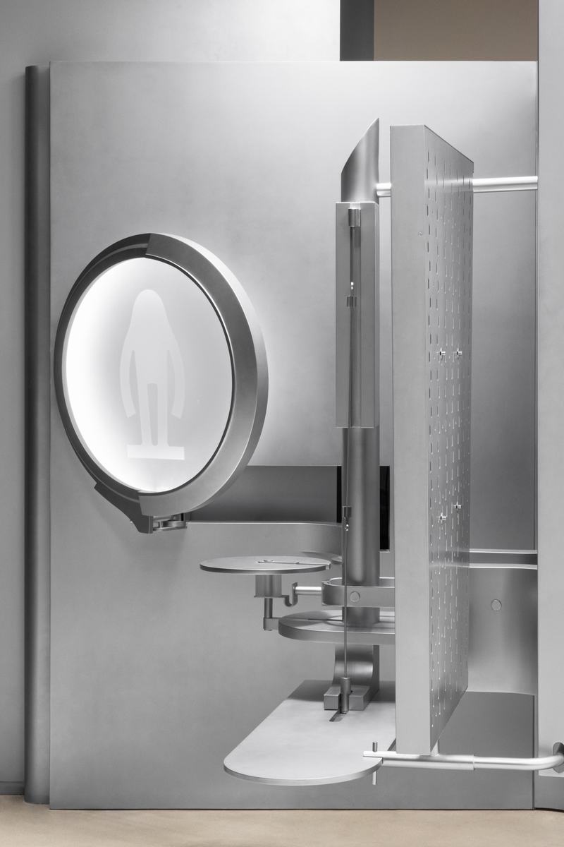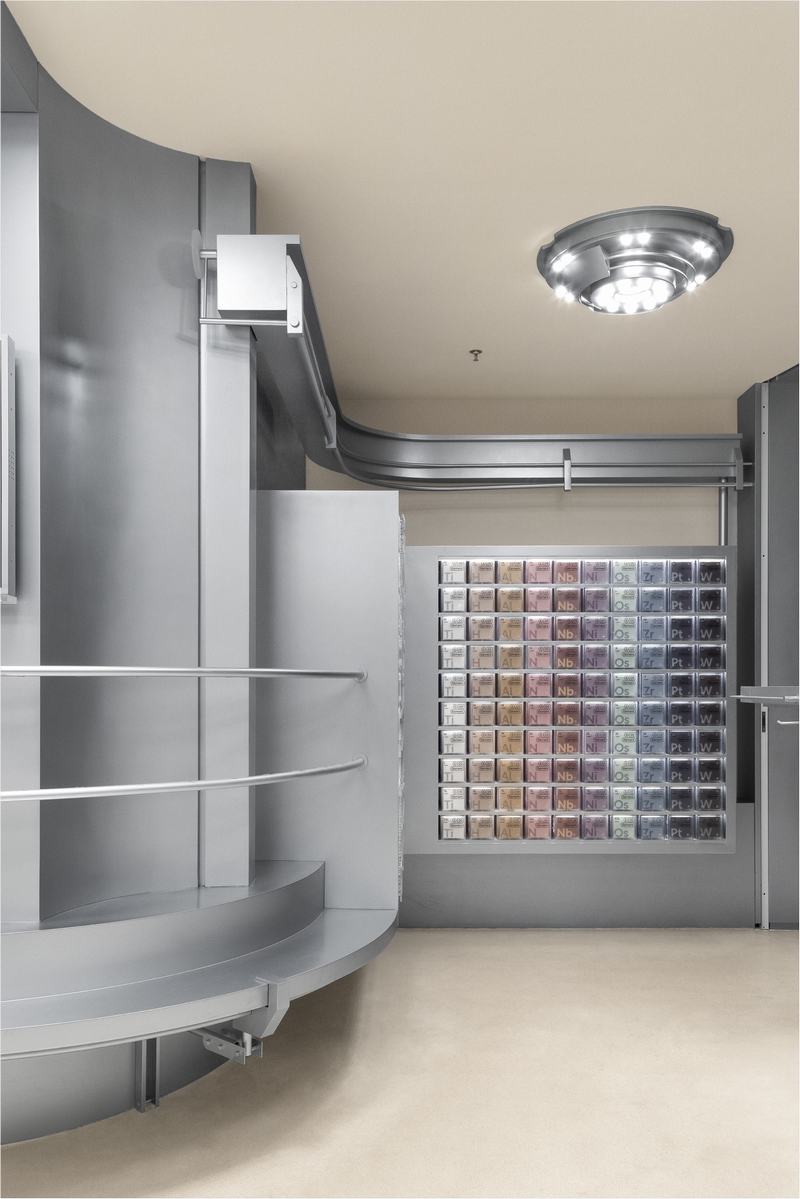 几何抽象的组合是通过设计师对非常规线条和材料的实验来实现的。最后,铝的强度和柔韧性的双重特点使其成为再加工和感官入侵交替的理想材料,而夯土和丙烯酸的结合缓解了这种戏剧性的冲突。材料、尺度和形式的相互作用,为个人的“悠闲”体验凿出了“重型”机械的印记。