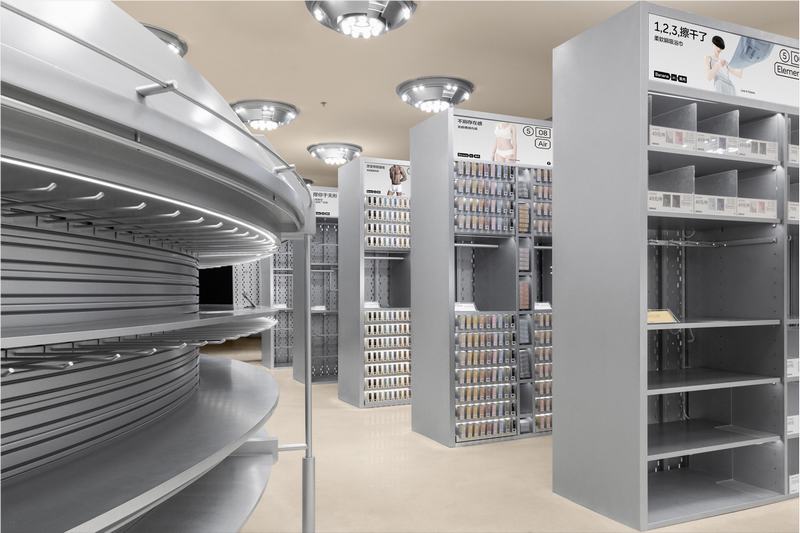 在规划概念店时,有人认为空间应该具备自然渗透的能力,内外空间是不可分割的,同样重要。倾斜排列的展示柜将空间分为前后两个区域,满足了展示香蕉产品的实际需求。在思考如何存放不同的产品时,引入了多个定制橱柜来存放内衣,避免了任何不可避免的尴尬。高回购率的商品放置在前中庭的巨大弧形单元中,以更加友好的方式为公众提供全面的心理和物理探索。