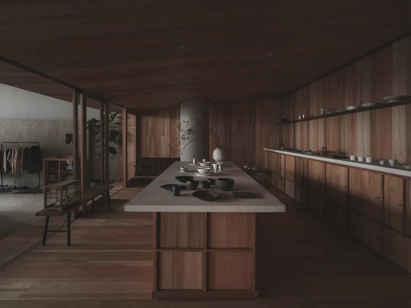 空间设计围绕内部的物质性,自然纹理和手工艺进行,反映了Lost&Found的艺术哲学和日常生活。