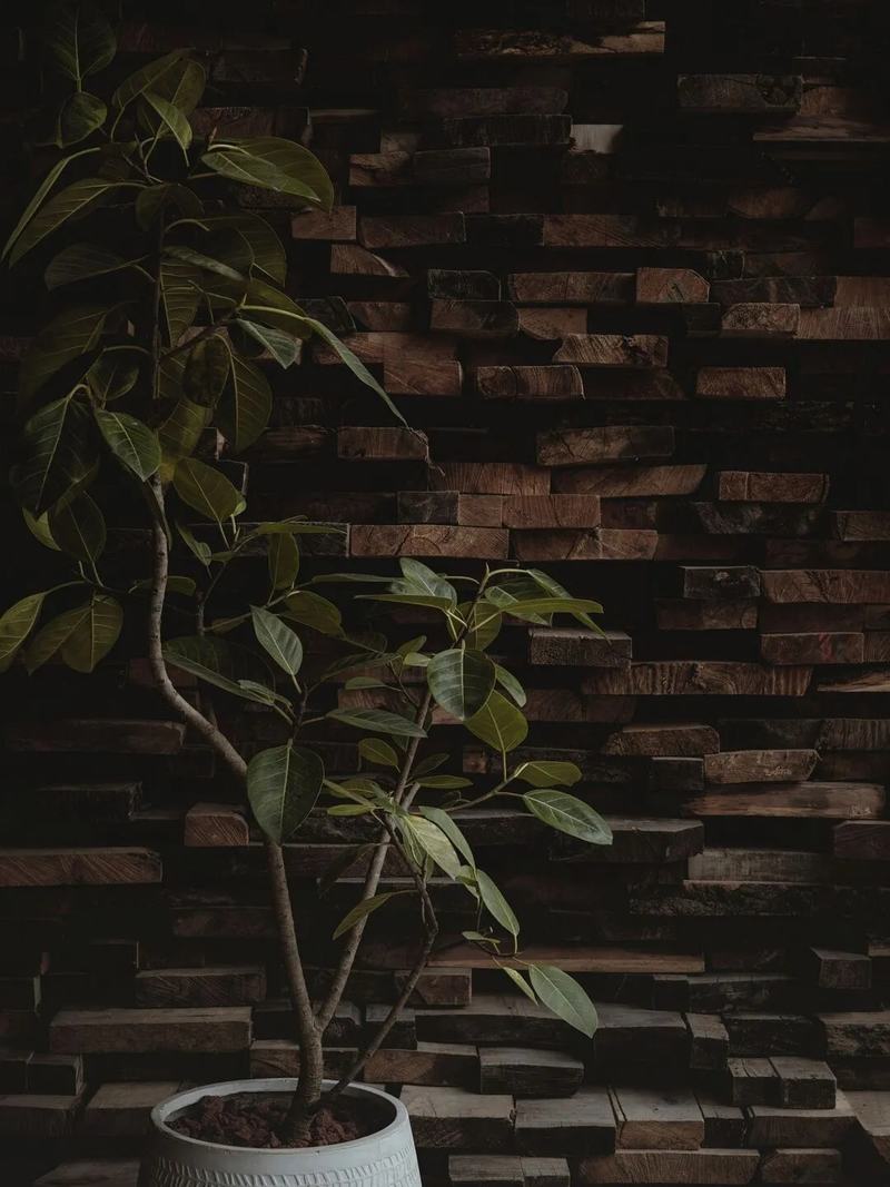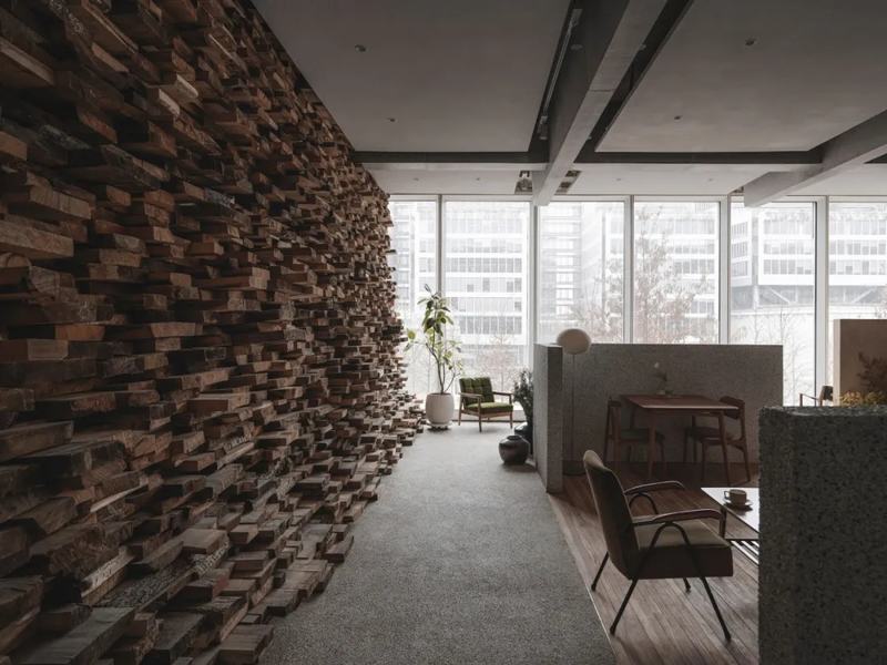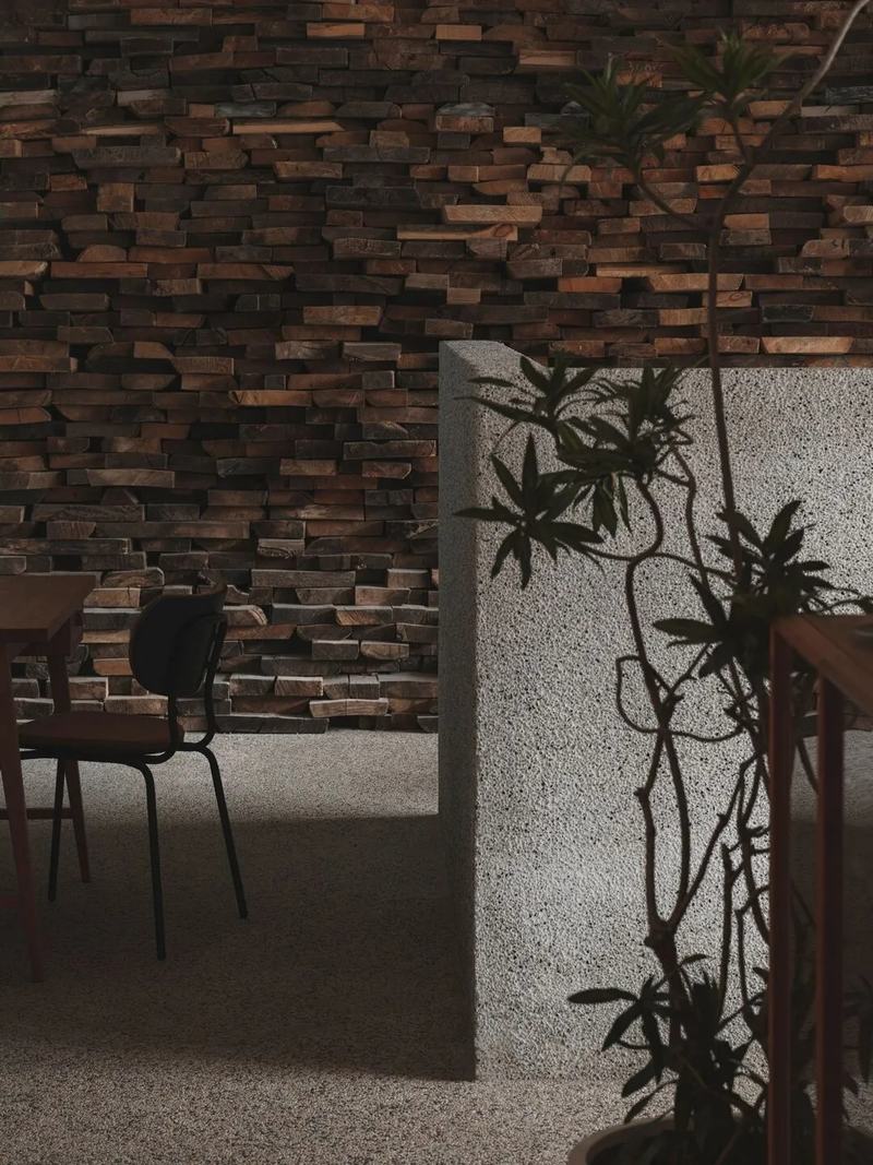 商店的另一个特点是展示空间一侧的木墙。整个墙面由堆叠的天然木材覆盖,是商店的视觉焦点,同时作为小物品的展示区域。