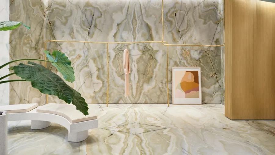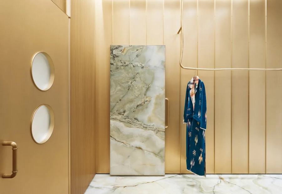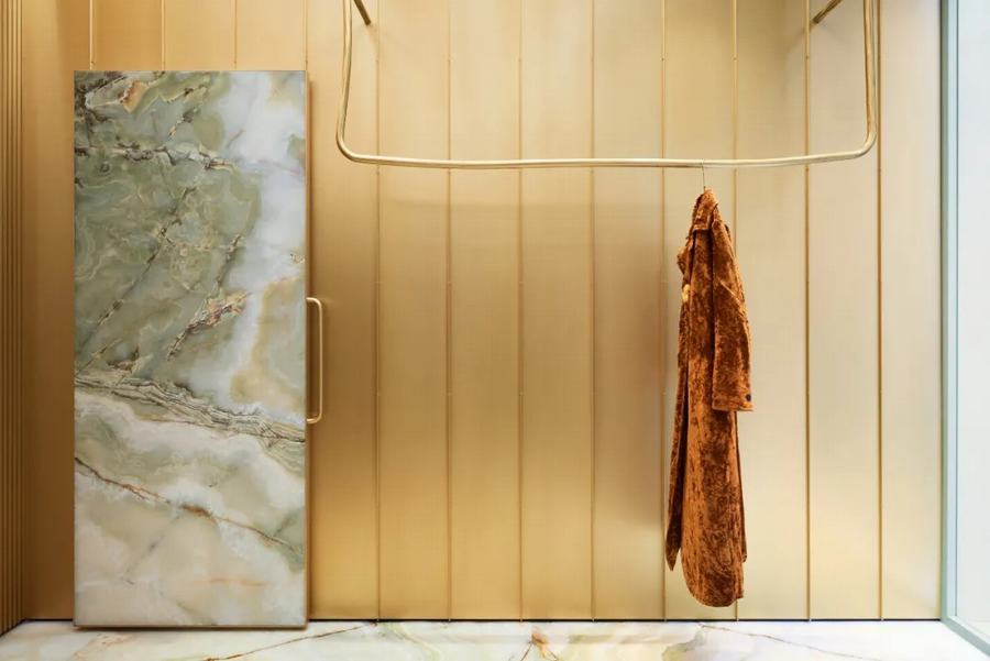 黄铜作为一种强调材料来补充缟玛瑙,并用于形成衣架、弯曲的衣服扶手、镜子和架子。