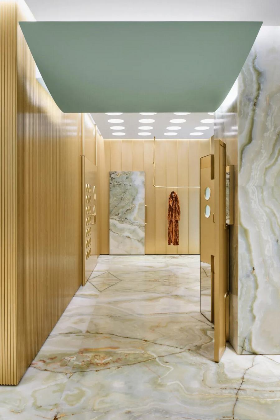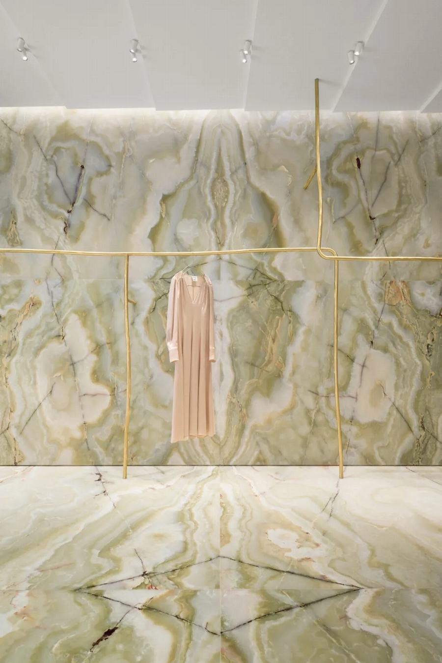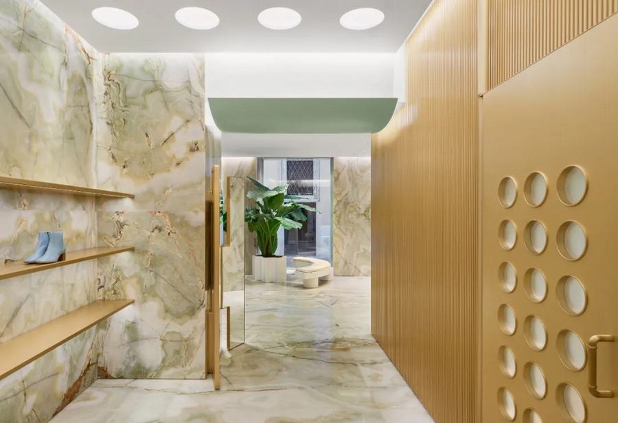 Giada Forte和Robert Vattilana想要创造一个与传统建筑的石灰华立面形成对比的室内设计。绿色缟玛瑙被应用到室内,这种珍贵的材料有着独特的设计,其大理石花纹的环圈中包含着一千年的历史。“绿色的缟玛瑙在店内创造了一种完全的沉浸感:它淹没了整个空间,从地板到墙壁。”