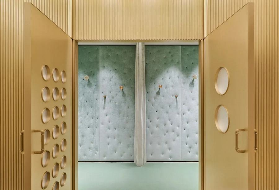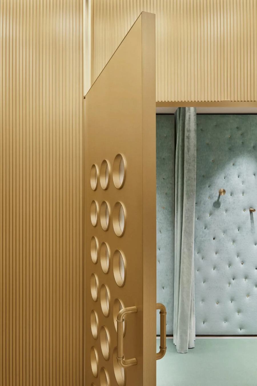 在商店最靠近入口的部分,天花板采用了白色的重叠面板,而在更深处,设计师安装了白色的灰泥天花板,点缀着舷窗照明。舷窗也装饰着更衣室的黄铜门,这些门的墙壁覆盖着鼠尾草色的天鹅绒,创造了一个“卧室般的”内部。