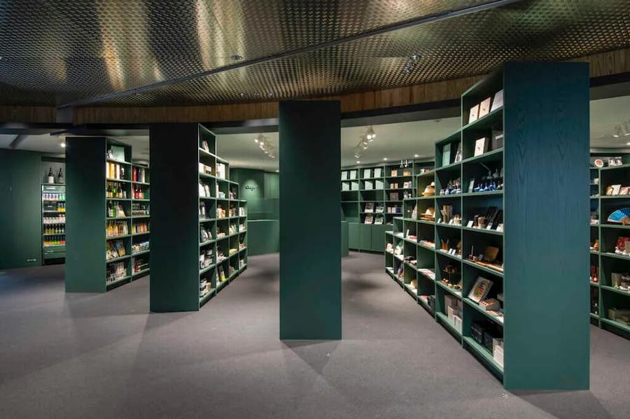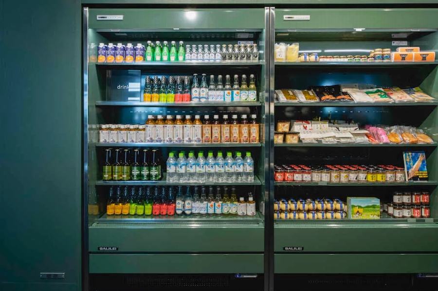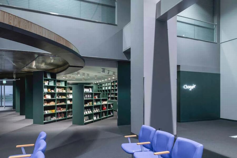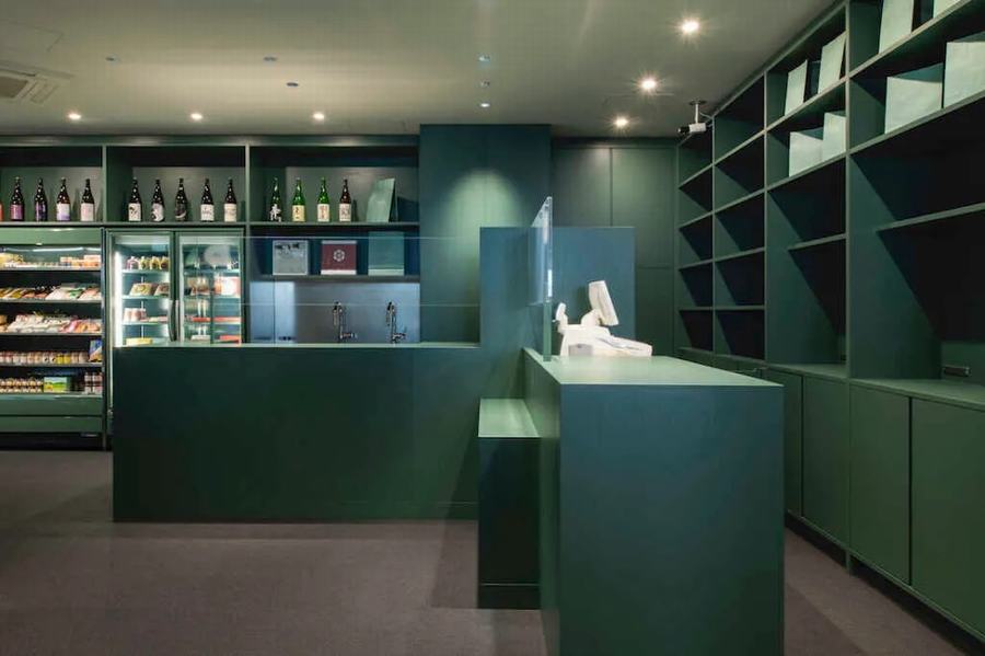 这样一来,作为店铺的门面,在展示压倒性的商品量的同时,随着往里走,也能感受到开放感。同时,通过在空间内侧营造开放感,尽可能避免从内侧产生死角。在里面,有一个与收银台整合在一起的清酒等品酒空间。包括冷藏箱在内的所有固定装置都应统一为浅绿色,以作为从食物到商品的各种物品的背景,周围一片麦田环绕的绿色丰富的九州佐贺国际机场。