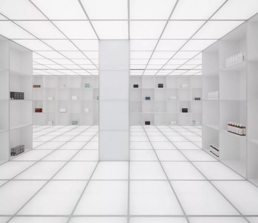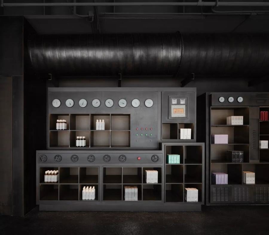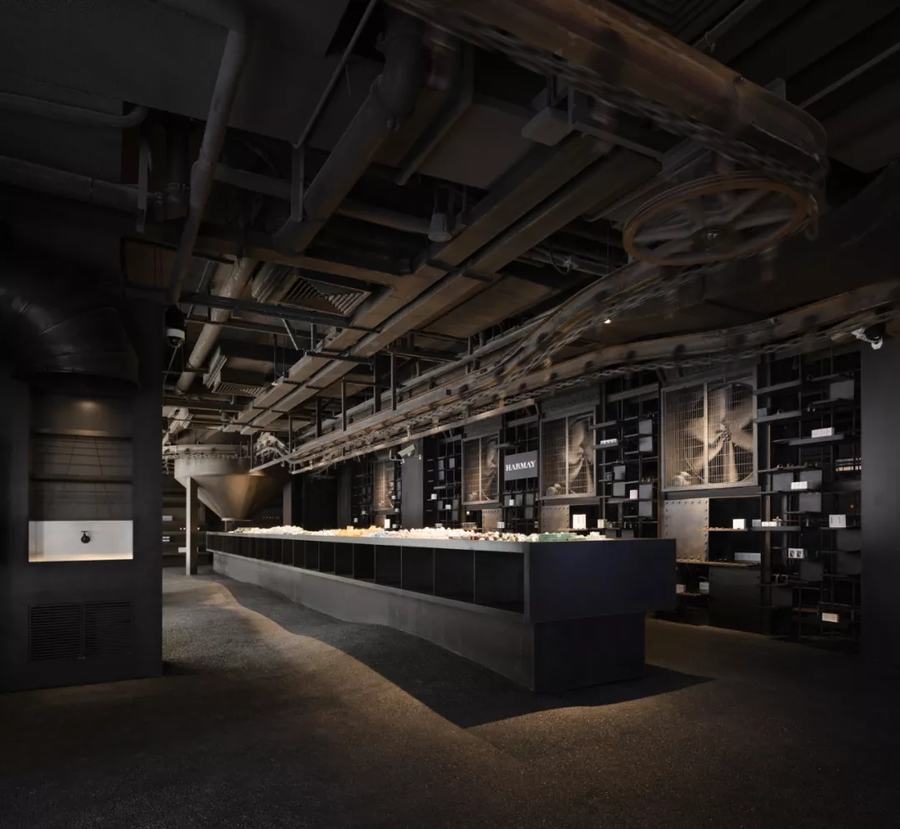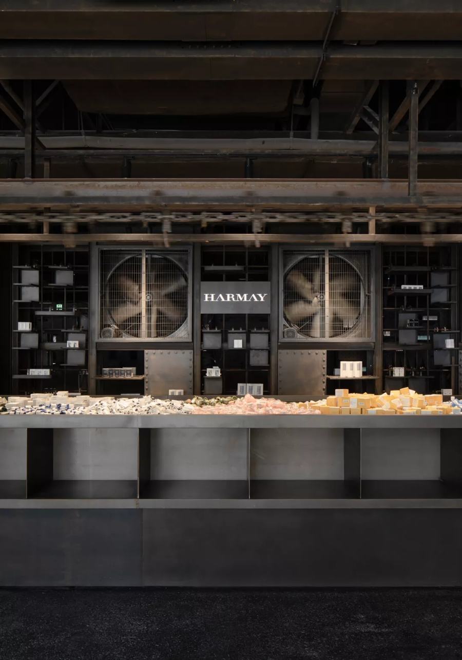 一进HARMAY话梅门店,顾客就会发现一个14米高的展示台,上面摆满了产品,下面是一个人造的工业装置,它通向一个有手推车的走廊,货架上摆满了更多的产品。这个空间或多或少是一个边界地带,尽管充满了不同的角落和缝隙,装满了诱人的商品。