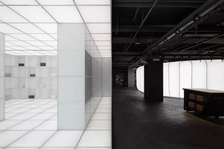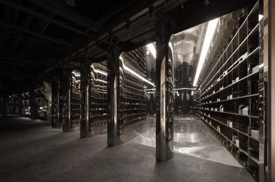 HARMAY话梅在北京开设了第二家门店,门店位于西单文化广场,室内设计由上海建筑事务所AIM architecture进行室内设计,从购物中心戏剧性的再开发中获得灵感,选择的设计主题是“混乱和秩序”。从黑暗和工业反乌托邦美学到鲜明对比的设置。