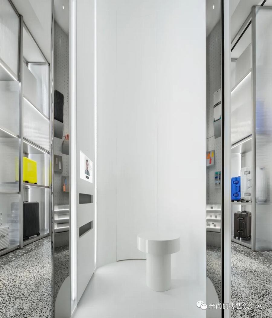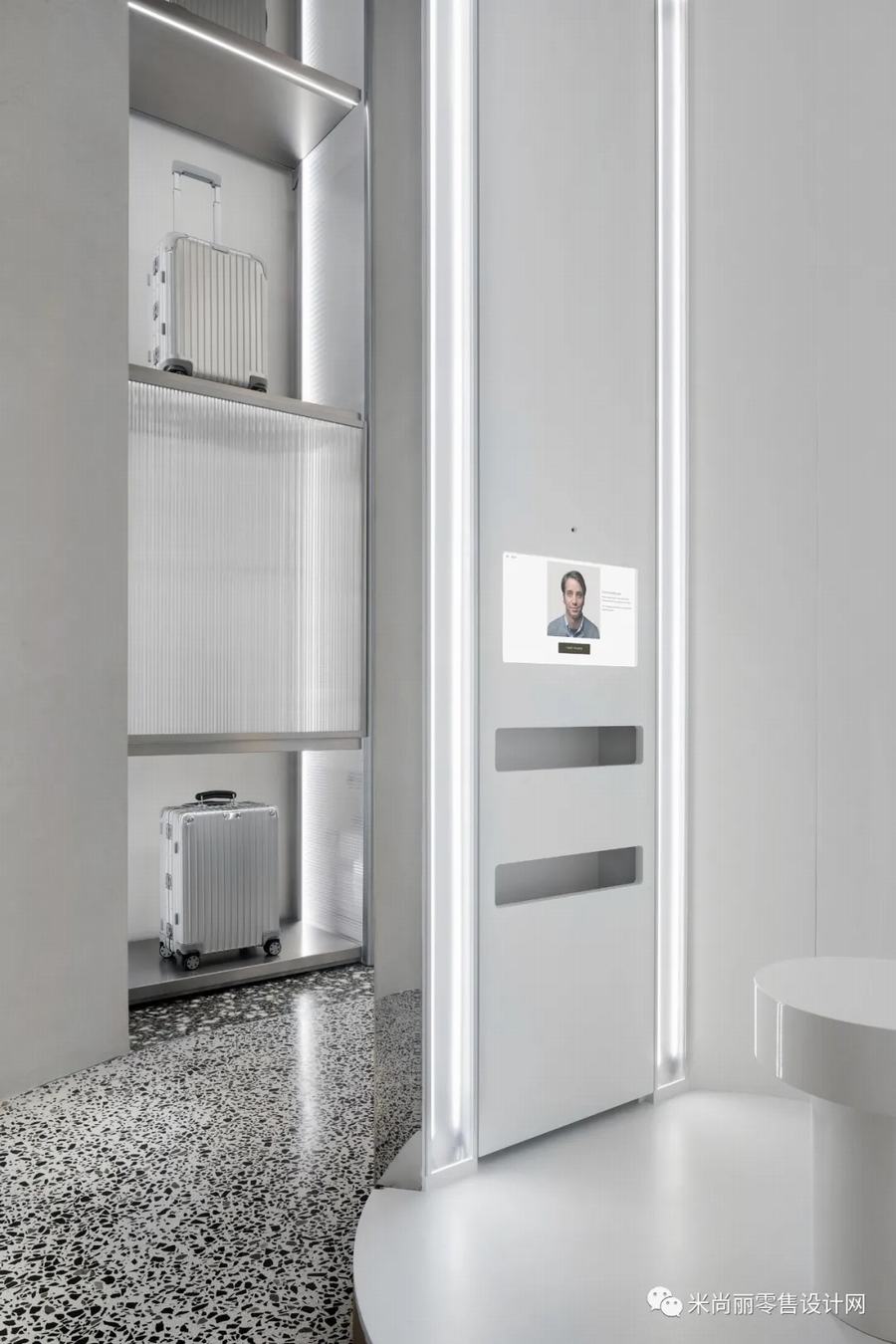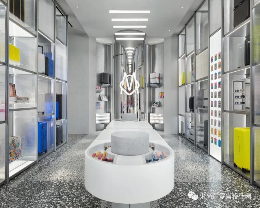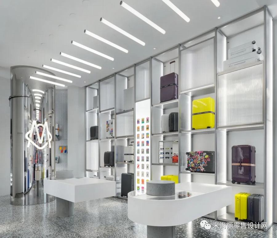 圆滑的、近乎临床的室内设计通过白色可丽耐、铝和聚碳酸酯的使用反映了该地区的工业环境和Rimowa的视觉语言。模块化的家具促进了商品的灵活性:空间的中心是一个3.81米长的多功能石桌,它分为两个由独立的柱子支撑的悬臂元素。突出Rimowa定制产品,如车轮、行李标签等,该功能可以很容易地重新安排,以适应某些显示的要求,或简单地改变客户的导航。拉丝铝架的适应性也很强,它结合了槽状聚碳酸酯隔板和白色调照明。